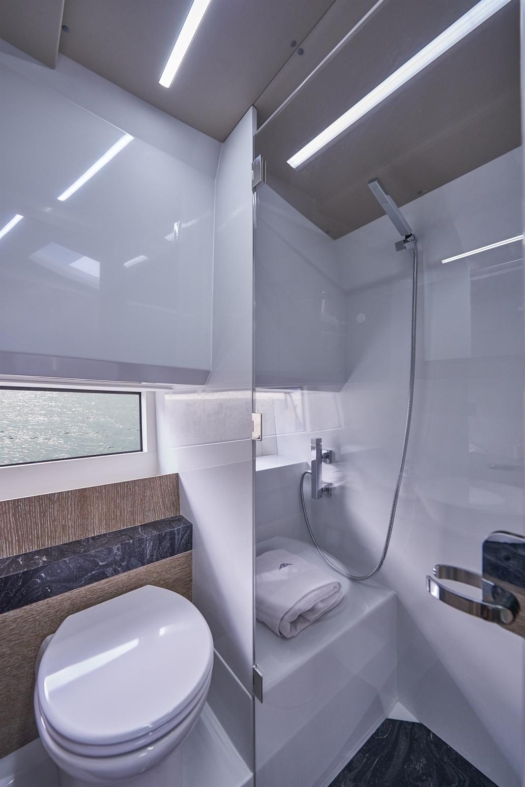 Lumières LED - Mobilier intérieur en chêne naturel - Revêtement intérieur gris - Plancher de cabine en bois - WC avec douche autoportante - WC électrique - Sol et dessus d’armoire dans les WC en corian