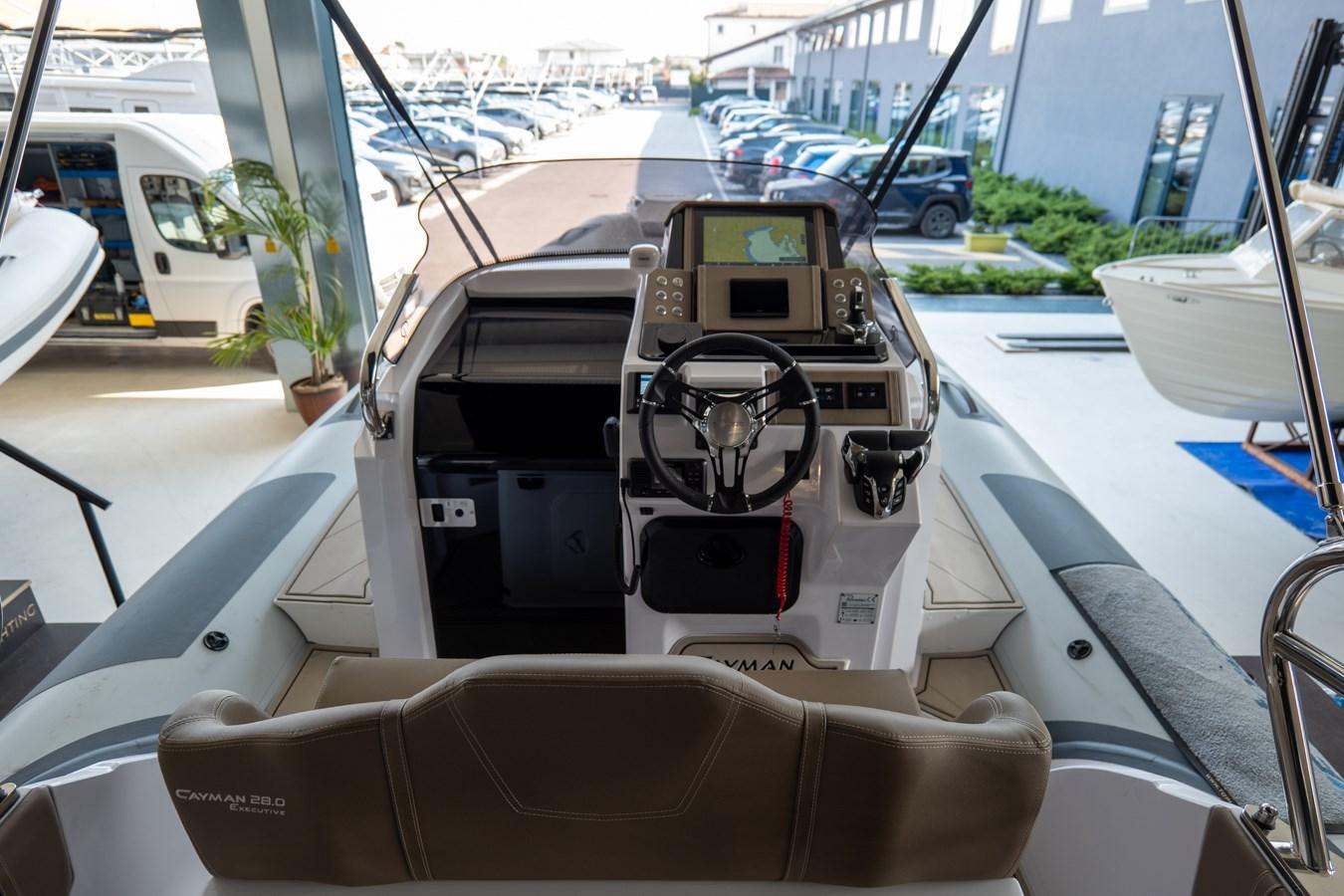 La coiffe exécutive Cayman 28.0 a été équipée du système H.I.S. de deuxième génération. L’assemblage de la coque avec le pont se fait avec le système C.S.A. (Cockpit Shock Absorber) et la motorisation fournie est en version monomoteur ou bimoteur hors bord.