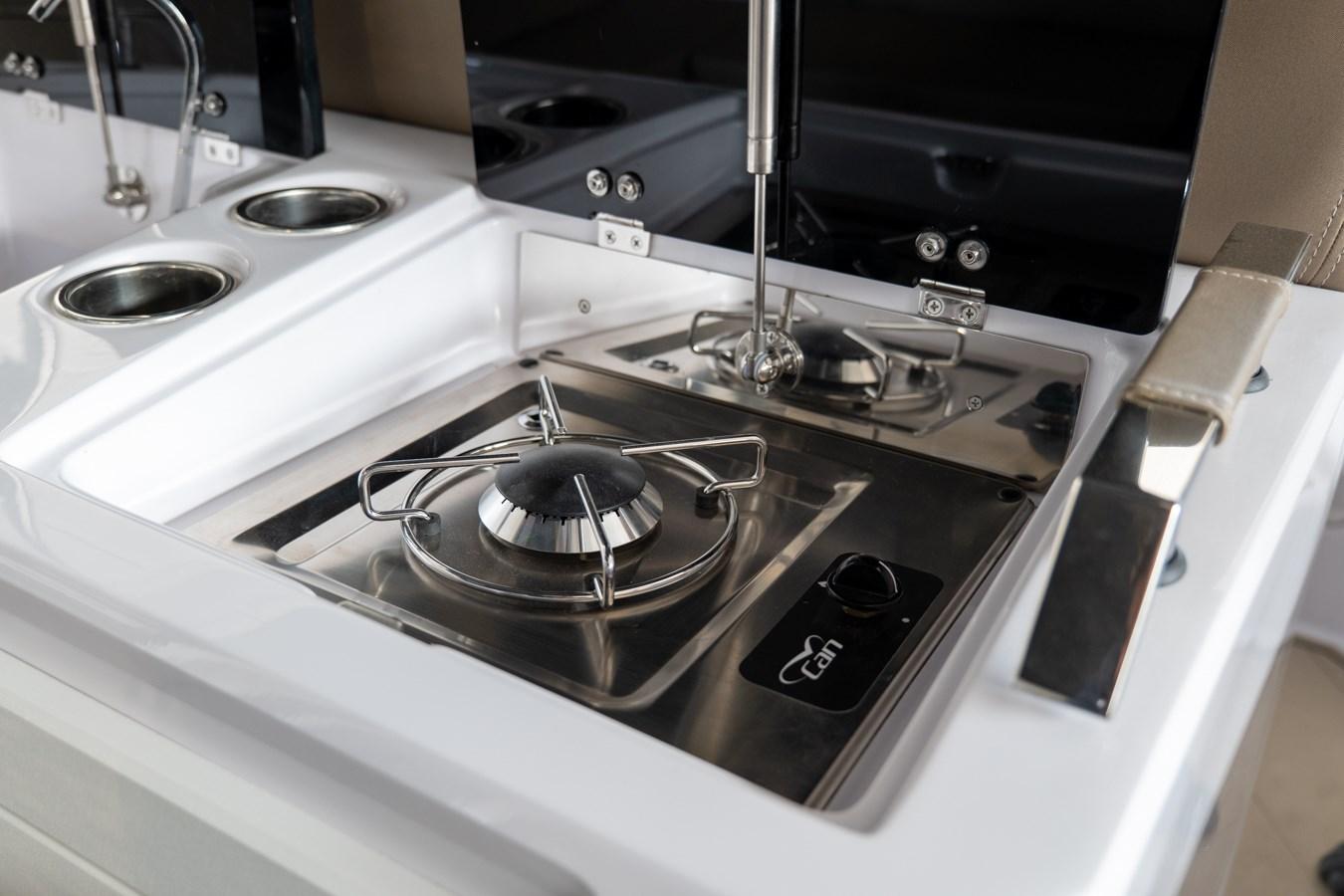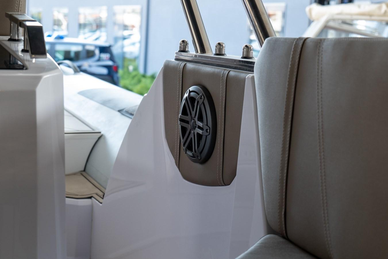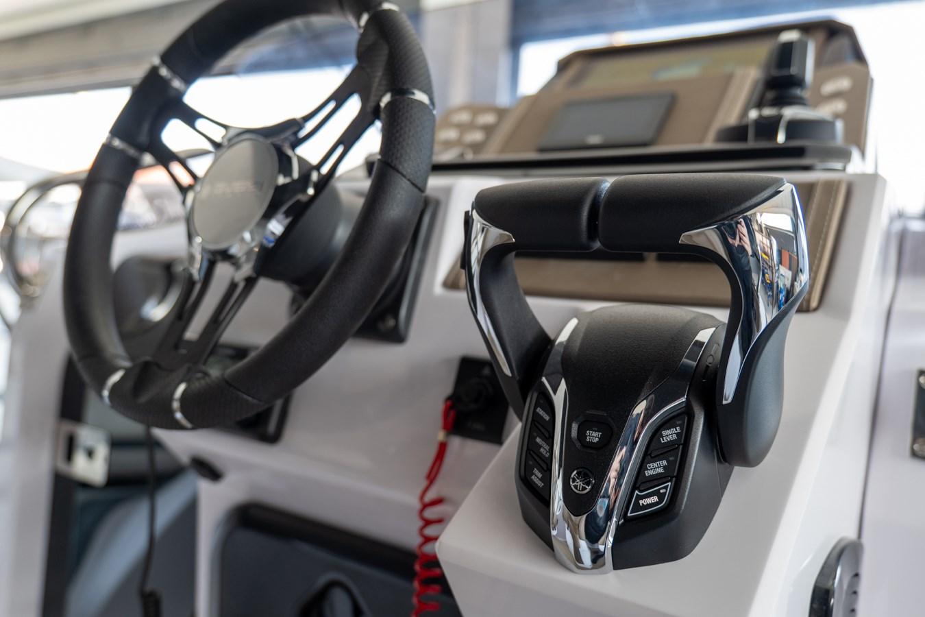 2 hublots de console - 4 crampons en acier inoxydable - Équipement de cabine de luxe - Extracteur de gaz - Coussins fermés à cellules fermées complets, anti-UV et résistants à l’eau - Coussin de bronzage à la proue - Canapé en tissu pouillé pouvant être transformé en lit double - Canapé cockpit en forme de « C » avec de grands casiers contre-moulés en dessous - Réfrigérateur externe en acier inoxydable - Crochets de remorquage et d’amarrage - Casier d’ancre contre-moulé et de collecte de chaînes - Casier de la console de direction avec porte - Casier arrière pour Accessoires d’amarrage - Casier guide debout avec porte - Casiers à contre-moulage à la proue - Gonfleur manuel - Système de douche complet - Système électrique complet - Feux de navigation - Armoire de salle de bain avec lavabo - Nez en fibre de verre à la proue - Trappe ouvrante à la proue - Panneau électrique avec panneau à boutons-poussoirs - Plateformes arrière avec échelle télescopique - Pompe de cale avec commande automatique/manuelle - Guindeau électrique - Réservoir de carburant en polyéthylène réticulé - Interrupteur de batterie à commande électrique avec commande manuelle d’urgence - Stand de conduite - Pied de conduite avec évier contre-moulé - Rembourrage externe standard - Rembourrage interne - Direction hydraulique complète jusqu’à 300 ch (hélice simple) - Klaxon électrique - Tubes bicolores gris arctique / inserts lisses - Toilettes marines électriques avec réservoir d’eau noire