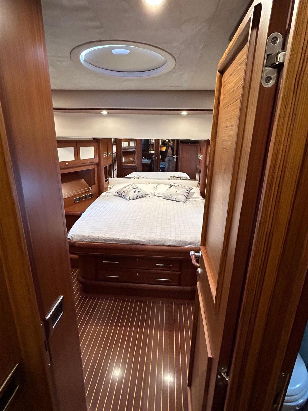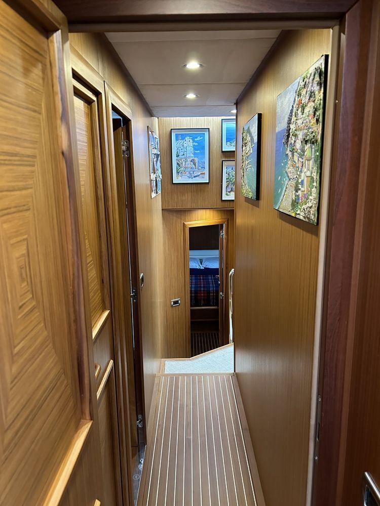 Aménagement 3 cabines 3 salles de bain + équipage : 1 cabine VIP à l’avant, 1 cabine à tribord avec 2 lits au sol, 1 cabine propriétaire au milieu du navire, 3 salles de bain, 1 cabine équipage arrière avec un lit simple et salle de bain, 1 cabine équipage avec deux lits superposés avec salle de bain avant accès à la salle des machines