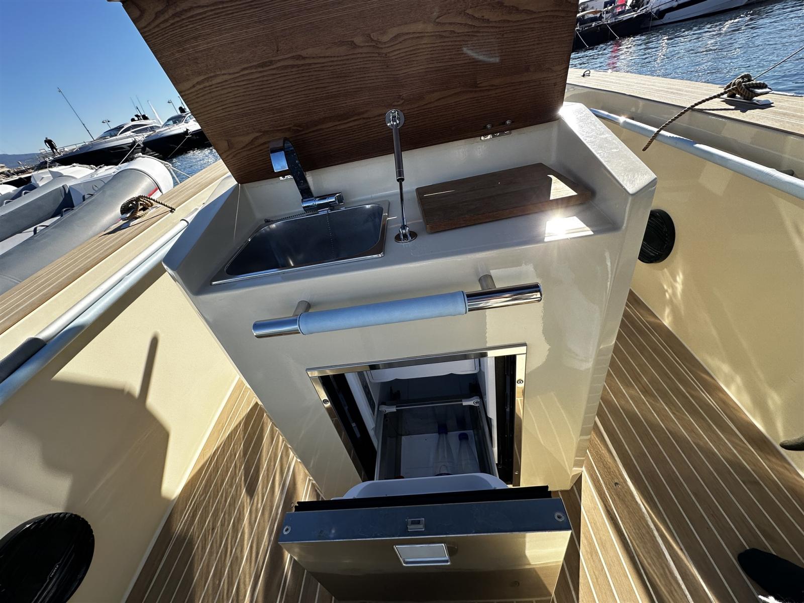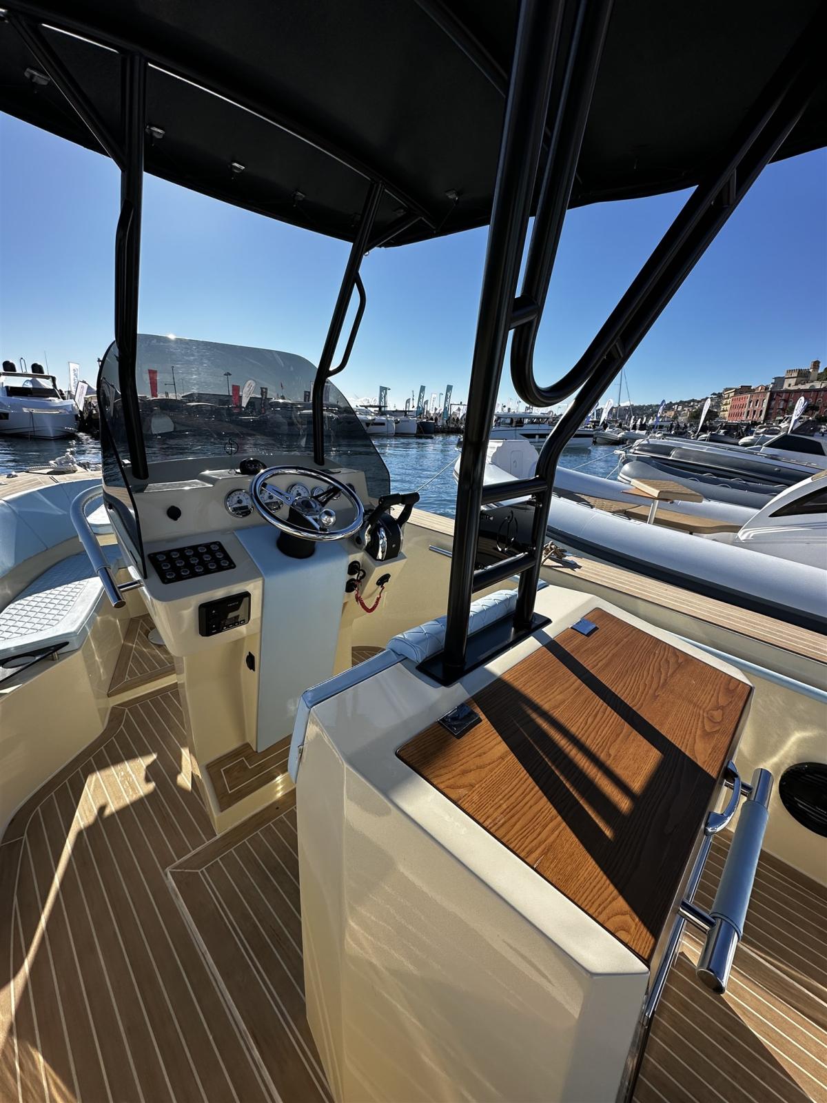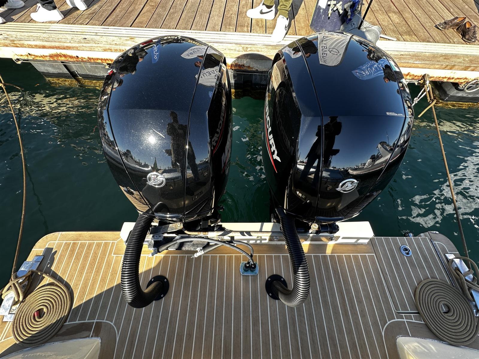 Alarme moteur, Eau sous pression, 2 Batteries (100 AH), 6 Taquets pliants (Seasmart), Douche de cockpit, Extincteur(s) fixe(s), Cockpit en teck (Flexiteek fuga bianca), Guindeau électrique (Quick 500w), T-Top.