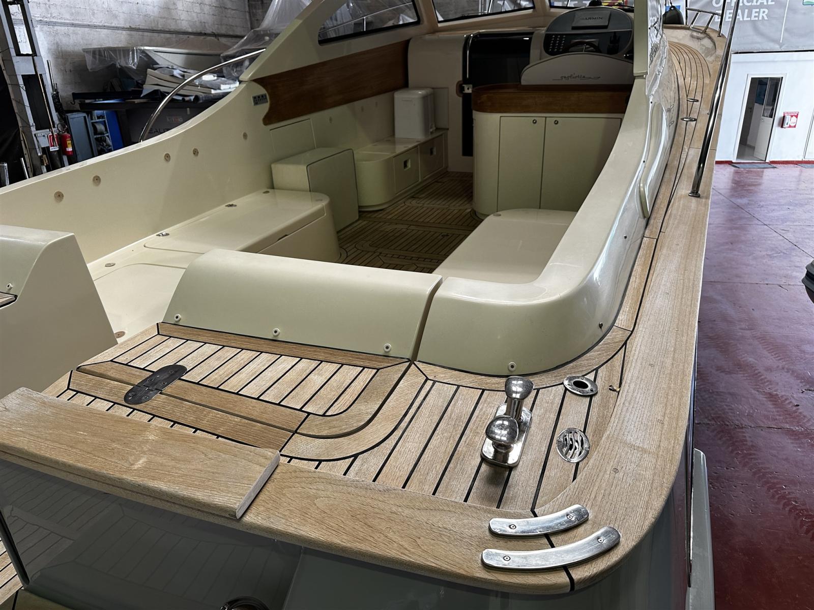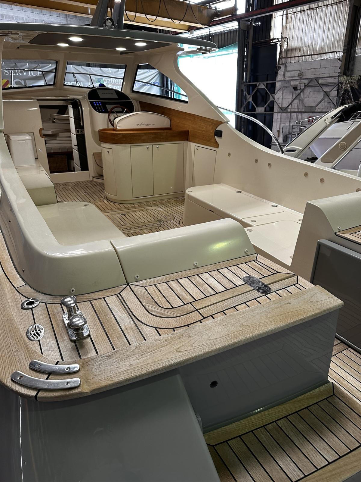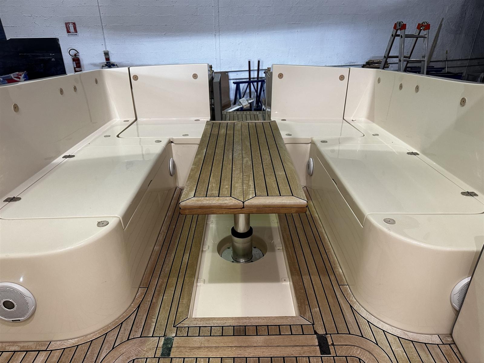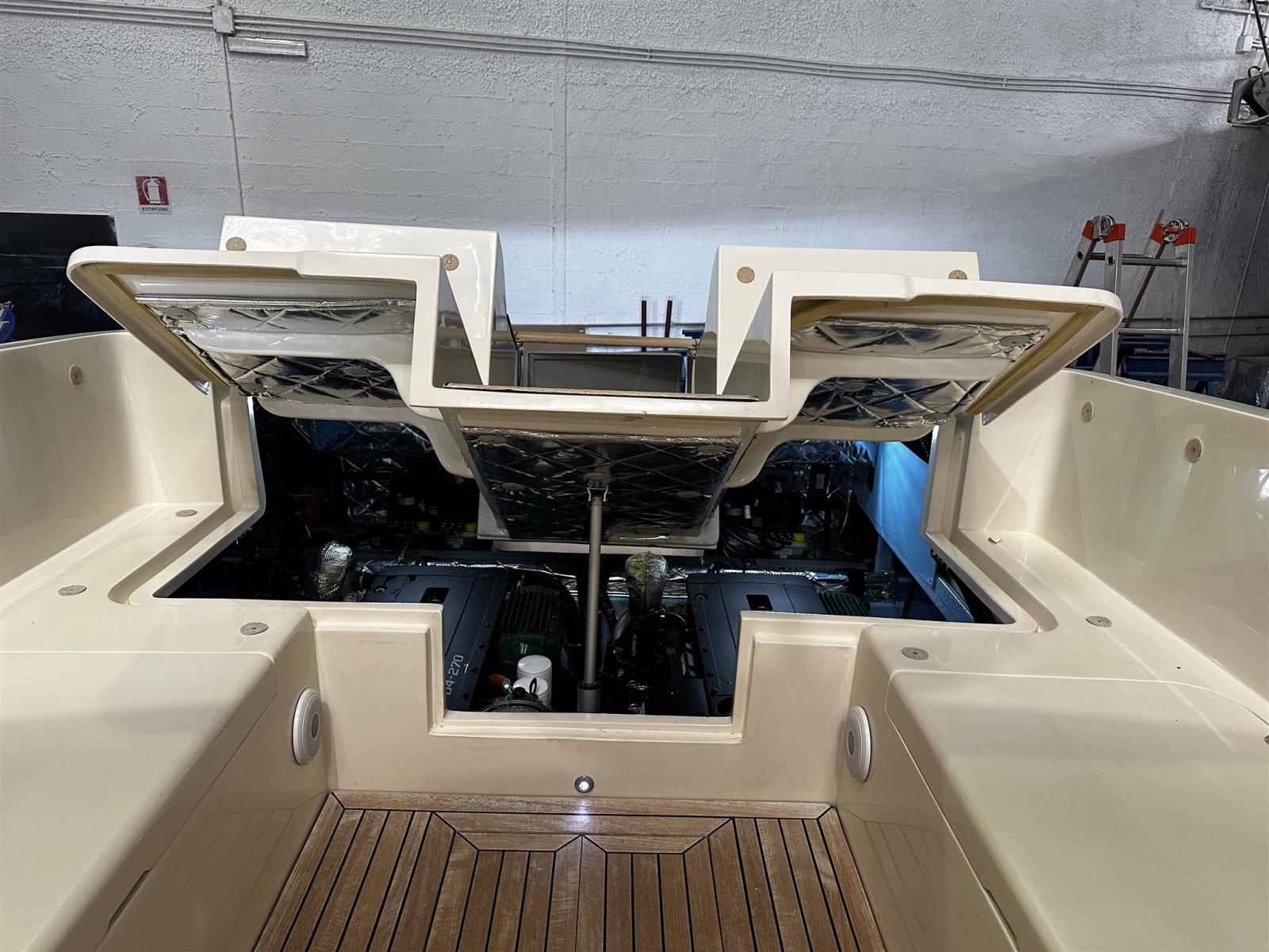 Alarme moteur, Alarme de pompe de cale, Ouverture du compartiment moteur électrique (Sala macchine poppa), Eau sous pression, Passavant en teck (fino a ponte di prua), Douche de cockpit, Flaps hydrauliques, Hard top, Extincteur(s) fixe(s), Indicateurs de flaps, Lavabo dans le cockpit, Éclairage de courtoisie, Passerelle (Besenzoni bianca a scomparsa), Pompe de cale automatique, Cockpit en teck (Pozzetto completo), Prise de quai, Onduleur, Guindeau électrique, table de cockpit (Elettrico pozzetto di poppa).