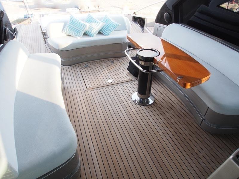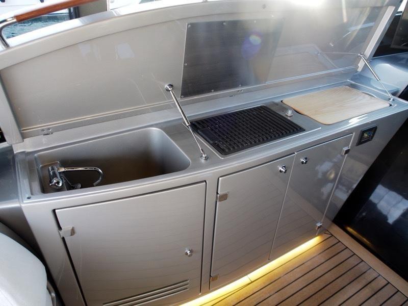 Terrasse : grande dînette avec canapés et table à manger, sur les côtés armoires de bar équipées d’évier, grill, réfrigérateurs et machine à glaçons ; poste de pilotage central ; Bain de soleil arrière et avant.