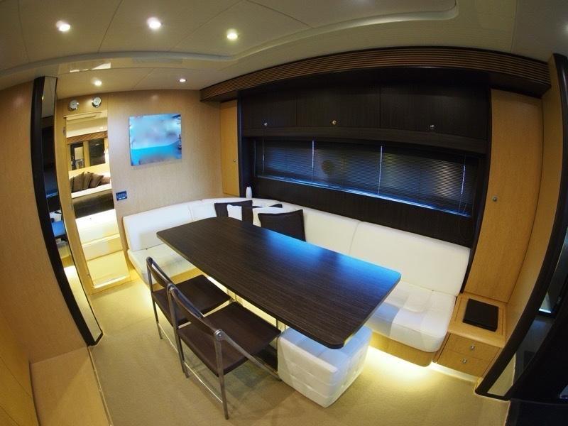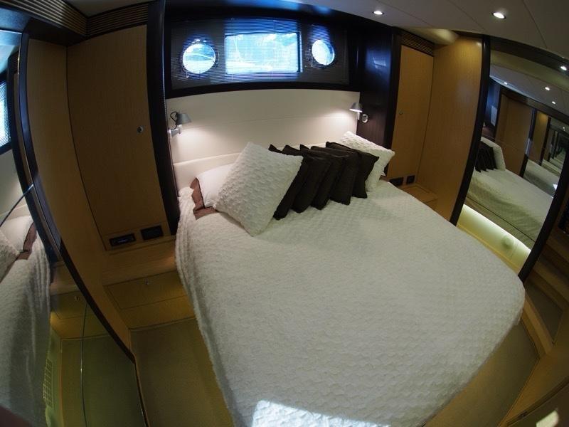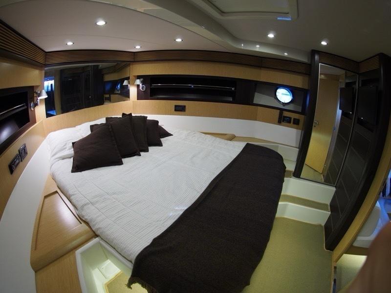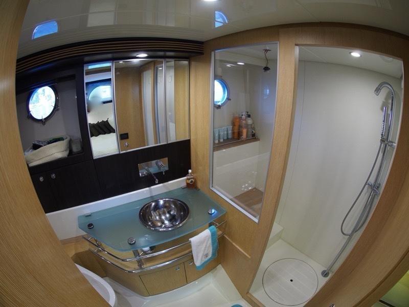 Sous le pont : dînette avec cuisine équipée et salle à manger, cabine propriétaire au milieu du navire avec salle de bain attenante ; cabine VIP à l’avant avec salle de bain attenante ; Cabine d’invités 2 lits simples ; salle de bain de jour ; Cabine marin avec salle de bain.