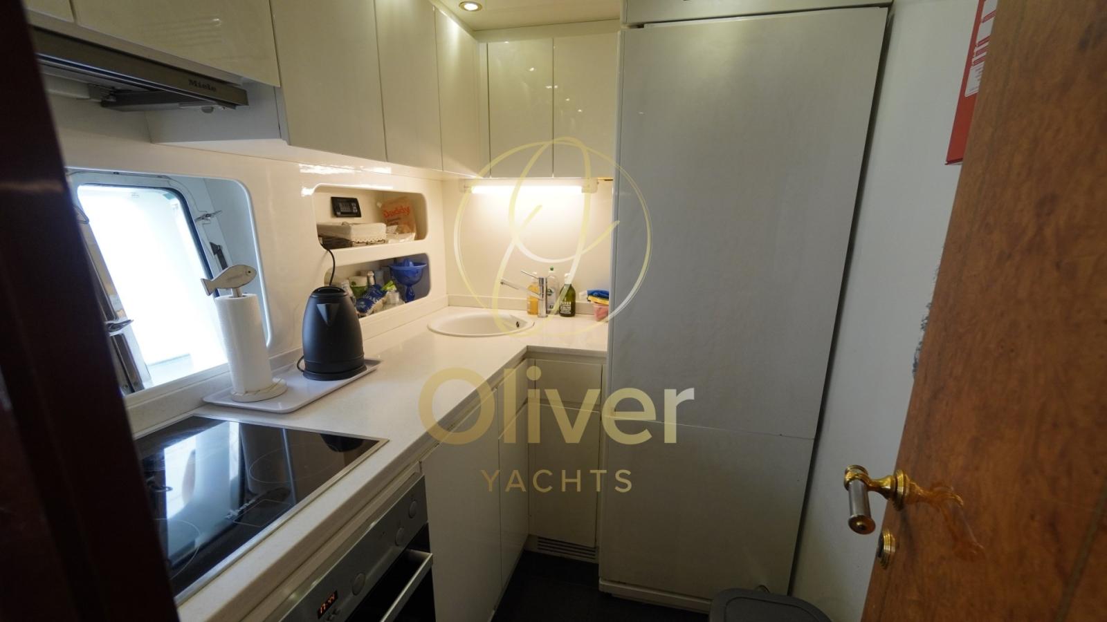 À tribord se trouve la cuisine séparée par la porte, entièrement équipée avec évier, réfrigérateur, congélateur, plaque à induction, four à micro-ondes et lave-vaisselle, parfait pour la vie à bord.