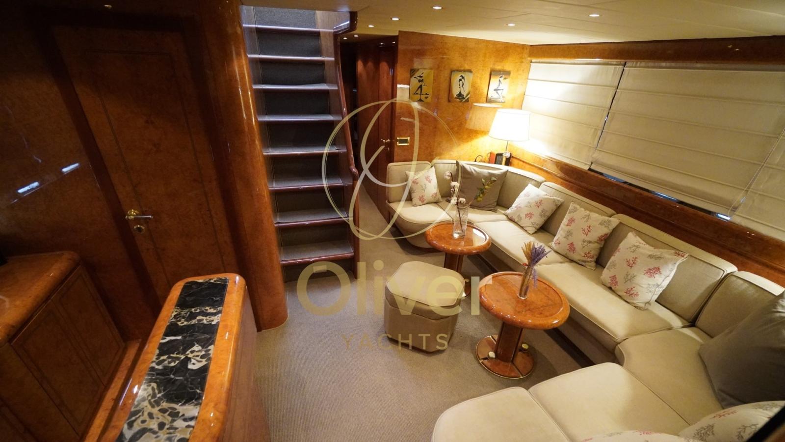 Les intérieurs du Mangusta 72 expriment tout le charme de l’artisanat italien, avec de grands espaces, des finitions raffinées et une excellente organisation fonctionnelle. L’entrée principale mène à la grande dînette intérieure, caractérisée par un canapé en forme de U avec une grande table à manger, idéale pour accueillir les invités dans un environnement élégant et confortable.