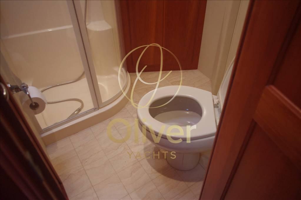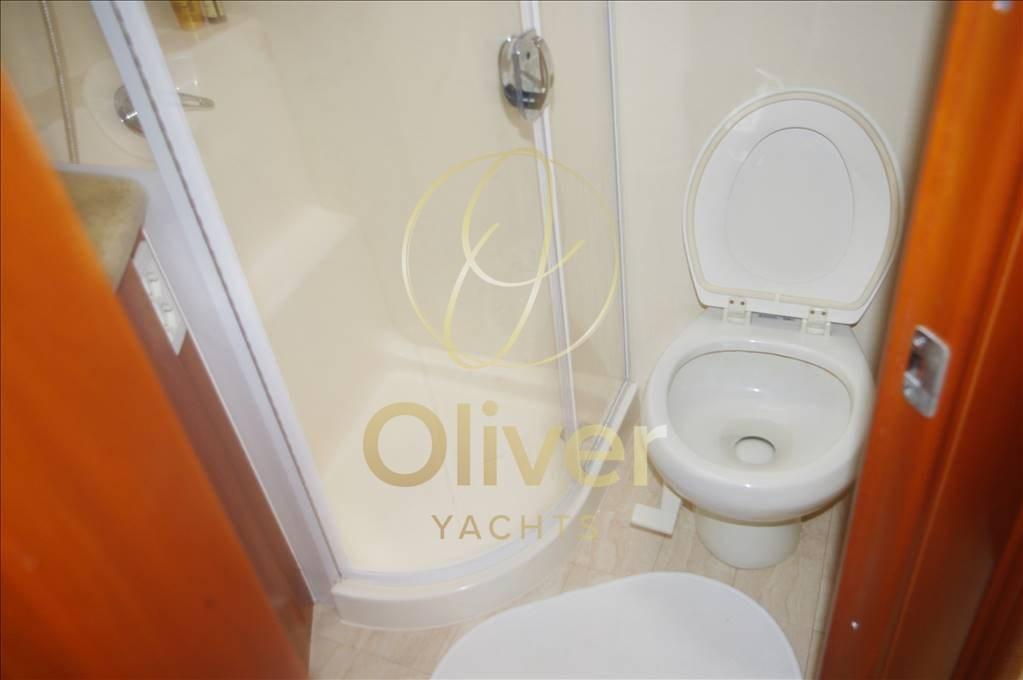 En descendant deux marches, vous entrez dans la zone de couchage avec la cabine double à bâbord et la cabine double française à tribord. À l’avant des deux cabines se trouvent deux toilettes, l’une exclusive à la cabine propriétaire et l’autre avec accès commun. Les deux disposent d’un lavabo, de toilettes et d’une douche séparée. Enfin, à l’avant se trouve la grande cabine propriétaire avec un lit double.