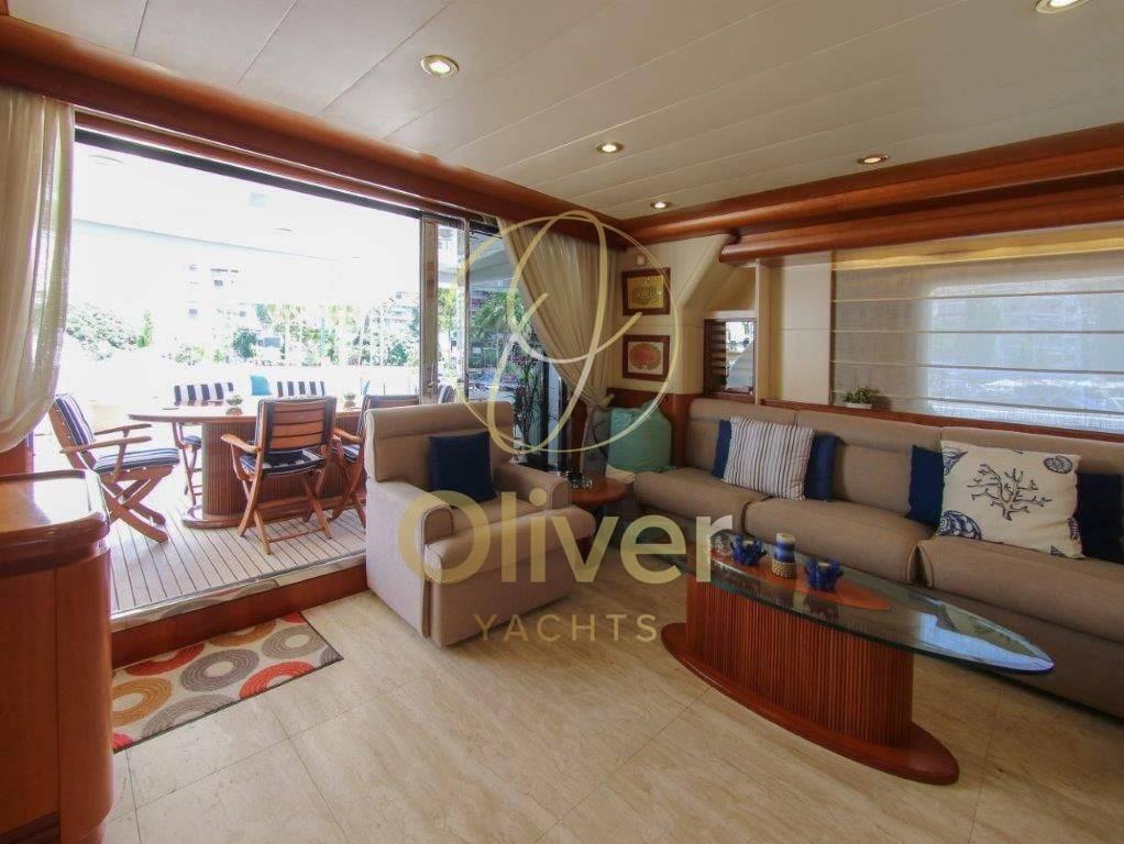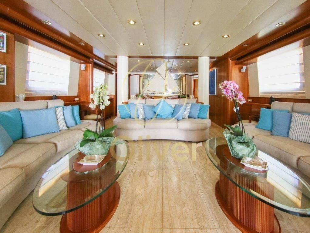 En entrant par la porte vitrée du cockpit, on accède au grand salon équipé d’un bar. Sur la gauche, il y a une table ronde juste en face du bar. Vers la proue se trouvent les trois canapés en demi-lune qui créent un environnement circulaire. La salle à manger est séparée du salon par une cloison semi-transparente afin d’avoir toute l’intimité nécessaire.