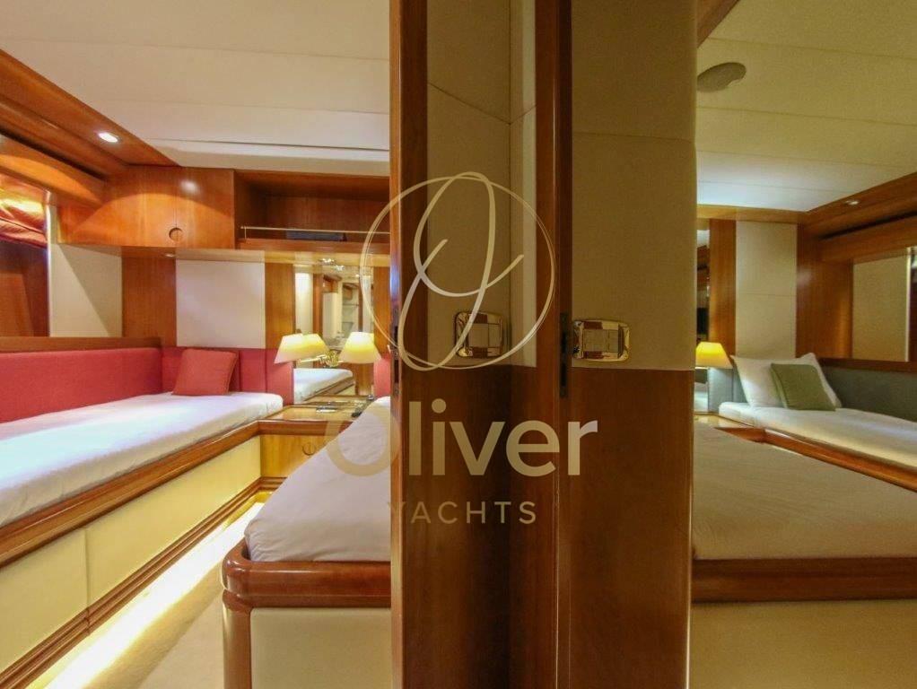Sur la gauche se trouve la porte d’accès à la grande cuisine entièrement équipée précédée d’un WC quotidien. Sur le côté tribord, en passant vers la proue, il y a un escalier pour accéder au pont inférieur, tout en continuant vers la proue, vous pouvez accéder à l’immense cabine principale pleine largeur avec dressing et salle de bain avec toilettes, bidet, double lavabo et baignoire.