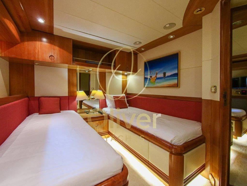 Sur le pont inférieur, vers la proue, il y a deux cabines doubles avec lits jumeaux. Les deux disposent d’armoires généreuses et d’une salle de bain avec toilettes, bidet, lavabo et douche