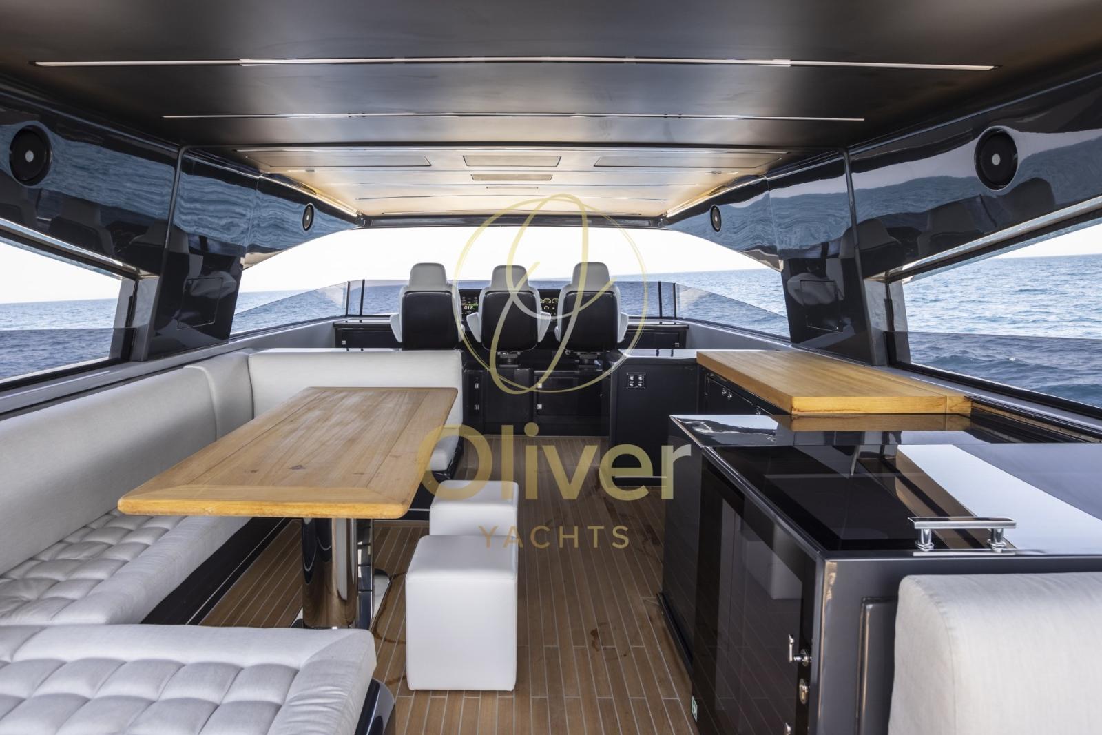Alarme gaz, Alarme moteur, Alarme de pompe de cale, Ouverture du compartiment moteur électrique, Auto Dynamic Trim Interceptor, Eau sous pression, Trim hydraulique, Taquets pliants, Passavant en teck, Couleur spéciale, Douche de cockpit, Phares fixes arrière, Phare de poursuite, Hard top, Extincteur(s) fixe(s), Lavabo dans le cockpit, Éclairage de courtoisie, Spots sous-marins, Passerelle, Plateforme arrière (Affondante), Pompe de cale automatique, Pompe de cale manuelle, Porte latérale, Porte latérale, Cockpit en teck, Prise de quai, Connexion eau sous pression à quai, Onduleur, Guindeau Hydraulique, Echelle de bain, Selles pour Annexe, Stabilisateurs, table de cockpit, Table pliante de salon, Corne, T-Top, Winch électrique arrière, Winch électrique avant.