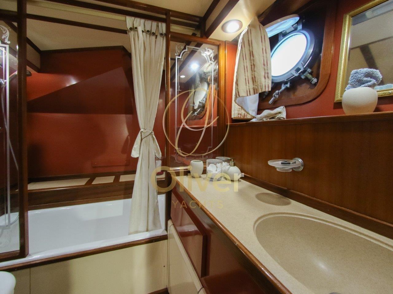 Alarme gaz, Alarme moteur, Alarme de pompe de cale, 2 Ancre, Eau sous pression, Passavant en teck, Douche de cockpit, Phares fixes arrière, Phare de poursuite, Grue de flybridge, Extincteur(s) fixe(s), Lavage de chaine, Éclairage de courtoisie, Passerelle, Pompe de cale automatique, Porte latérale, Porte latérale, Cockpit en teck, Prise de quai, Connexion eau sous pression à quai, Onduleur, Guindeau Hydraulique, Echelle de coupée, Echelle de bain, Selles pour Annexe, Système de filtration des eaux usées, Stabilisateurs, table de cockpit, Table pliante de salon, Filières avec sortie latèrale, Corne, Pont en teck, Winch électrique arrière.