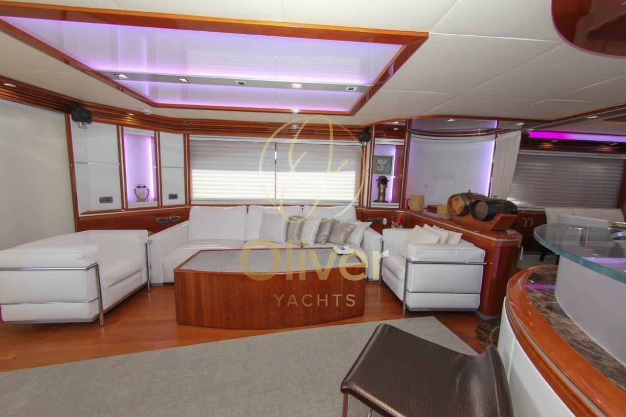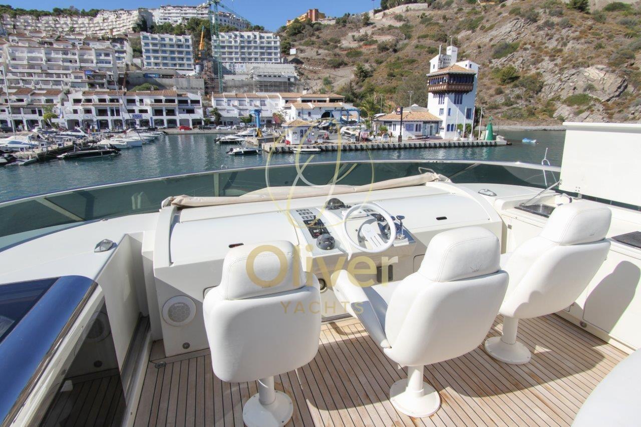 Flybridge : Le flybridge est un endroit idéal pour profiter de la vue panoramique et du soleil. Le grand bain de soleil est équipé de chaises longues et de canapés, tandis que le poste de pilotage offre une excellente visibilité. Un deuxième meuble bar et un barbecue complètent les installations du flybridge.