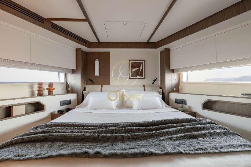 Située au cœur du bateau, la suite du propriétaire est une oasis de bien-être. Un lit king-size, un grand dressing et une salle de bain attenante avec double vasque et douche séparée offrent un maximum de confort et d’intimité. Les grandes fenêtres inondent l’environnement de lumière naturelle, créant une atmosphère relaxante.