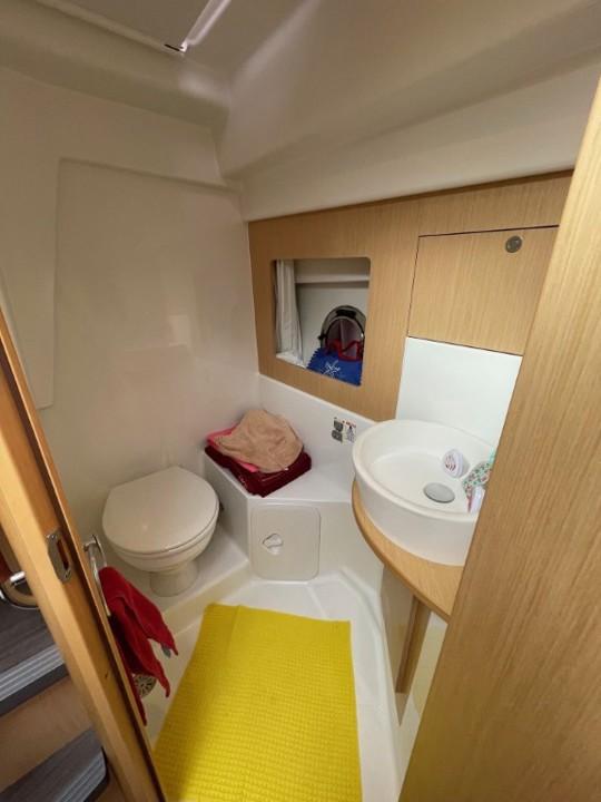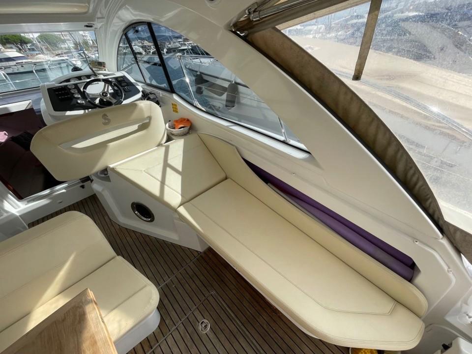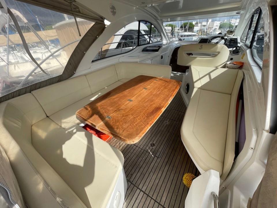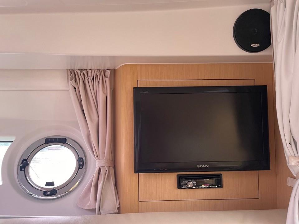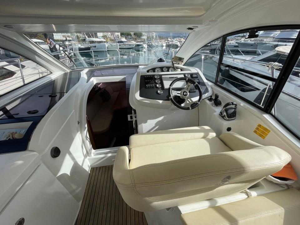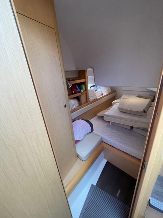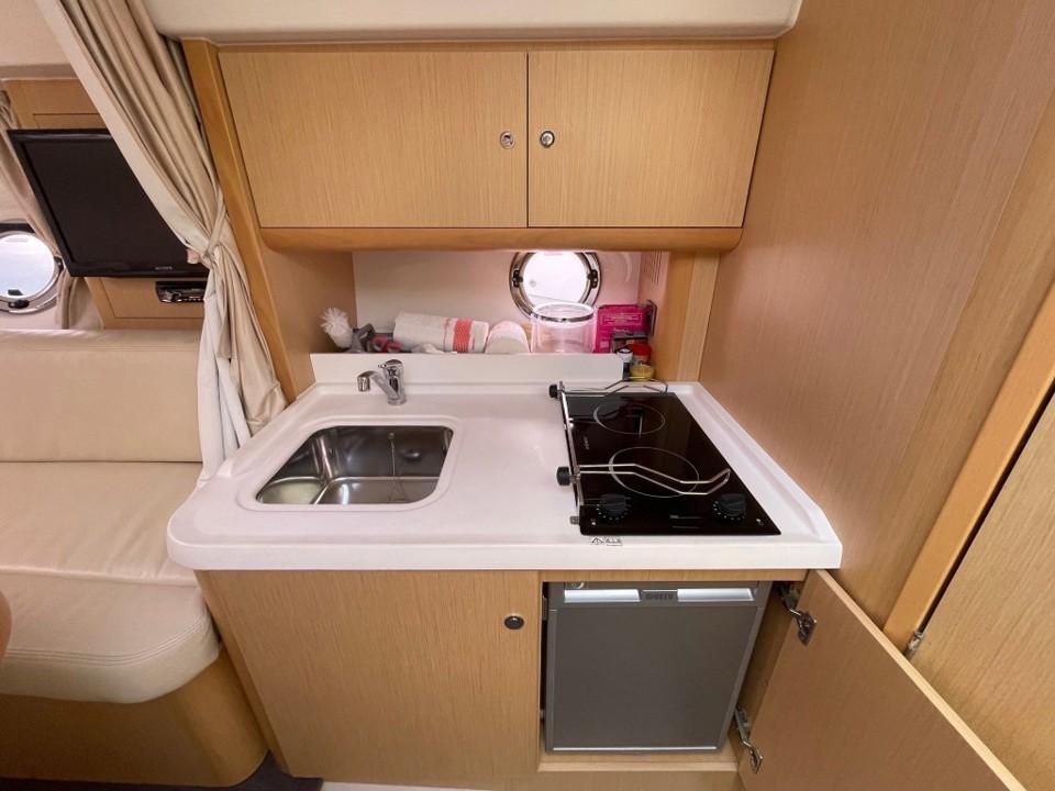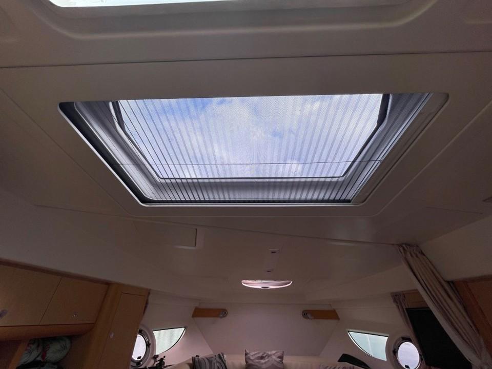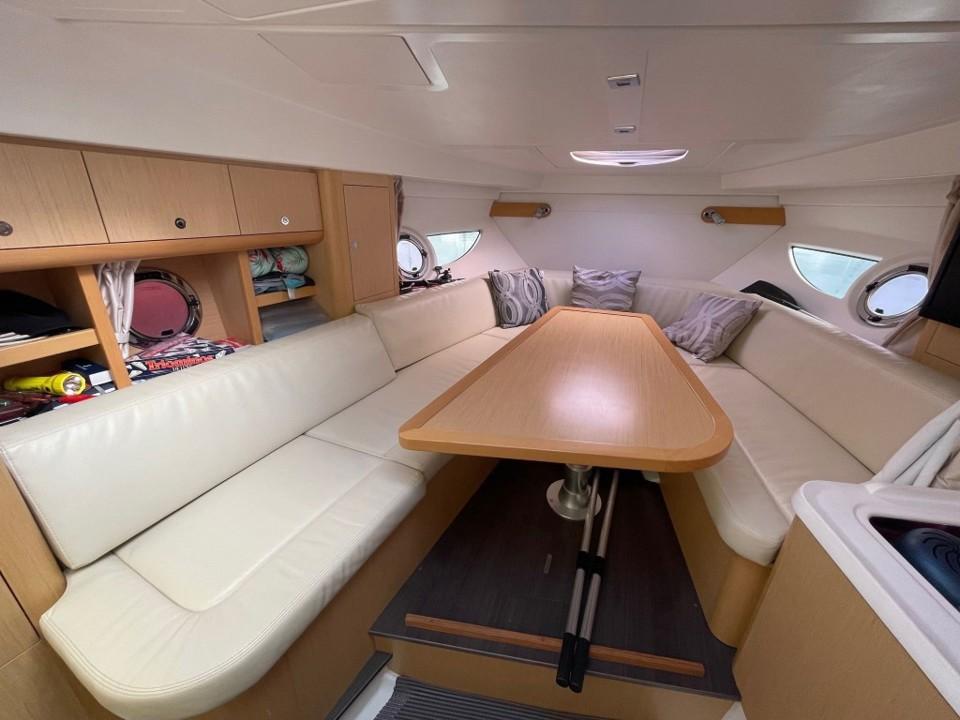 Son volume intérieur est surprenant. Il bénéficie de deux espaces de couchages indépendants, ainsi que de tous les équipements nécessaires aux croisières en famille ou entre amis. Boiserie clair et sellerie crème signent une ambiance contemporaine et chaleureuse à bord.