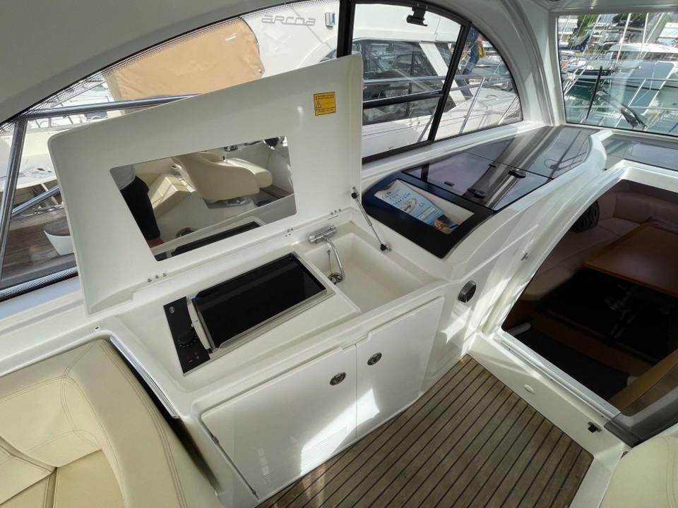 Le Gran Turismo 34 possède une allure résolument sportive. Conçu pour vivre pleinement la vie en mer par tous les temps, il offre un hardtop très protecteur avec toit ouvrant électrique. Le cockpit dispose d’un grand carré en U pour 6 personnes, convertible en grand bain de soleil. La Cuisine d'été avec Frigo, Plancha, et évier offre tout le confort nécessaire pour vos sorties.