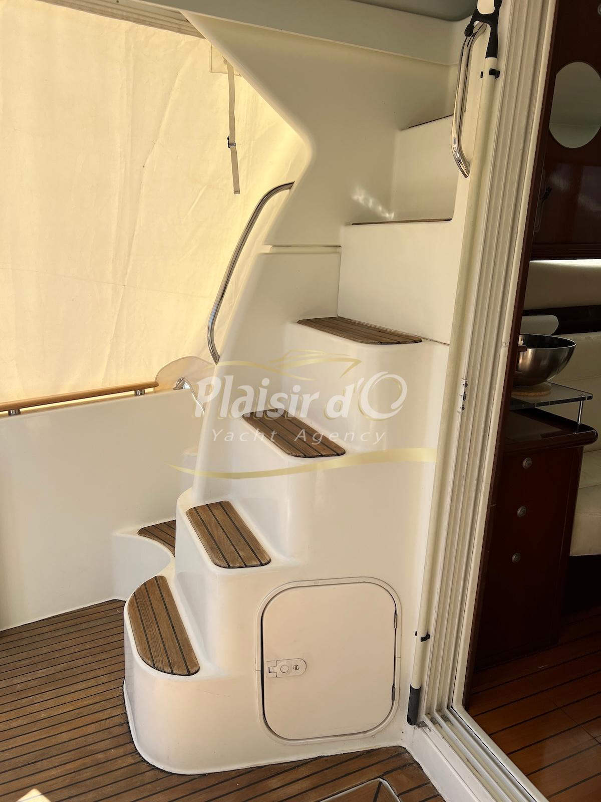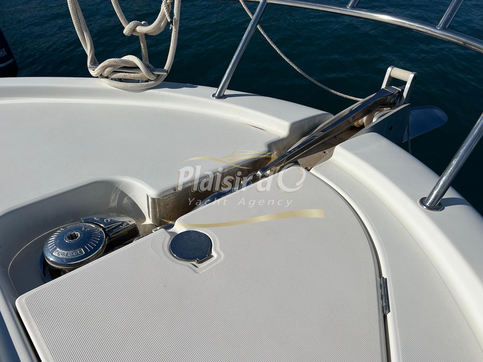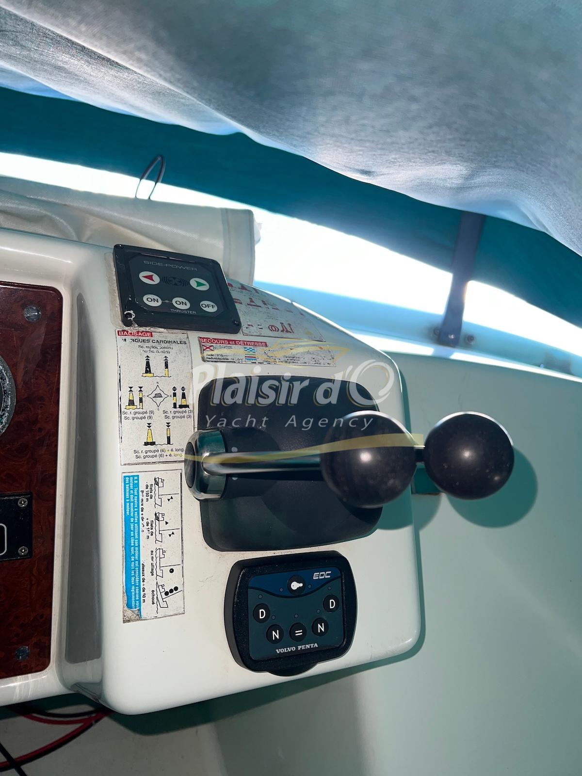 NOMBREUSES OPTIONS : Passerelle hydraulique Opacmare, propulseur d’étrave, pilote automatique, taud de camping, taud d’hivernage au flybridge, ancre Inox 16kg, VHF + Navtex, TV…
