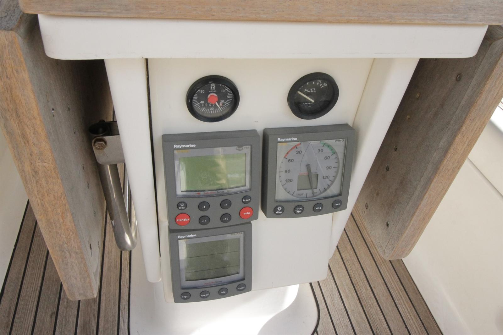 AIS (emetteur recepteur CLASSE B AIT 3000), Loch (Raymarine ST60), DSC VHF (ICOM MC 330), Pilote automatique (ST6001, direct drive electrique), Lecteur de cartes (RAYMARINE CHARTPLOTTER), Radio VHF (portable), Sondeur (Raymarine ST60), Anémomètre/Girouette (Raymarine ST60).