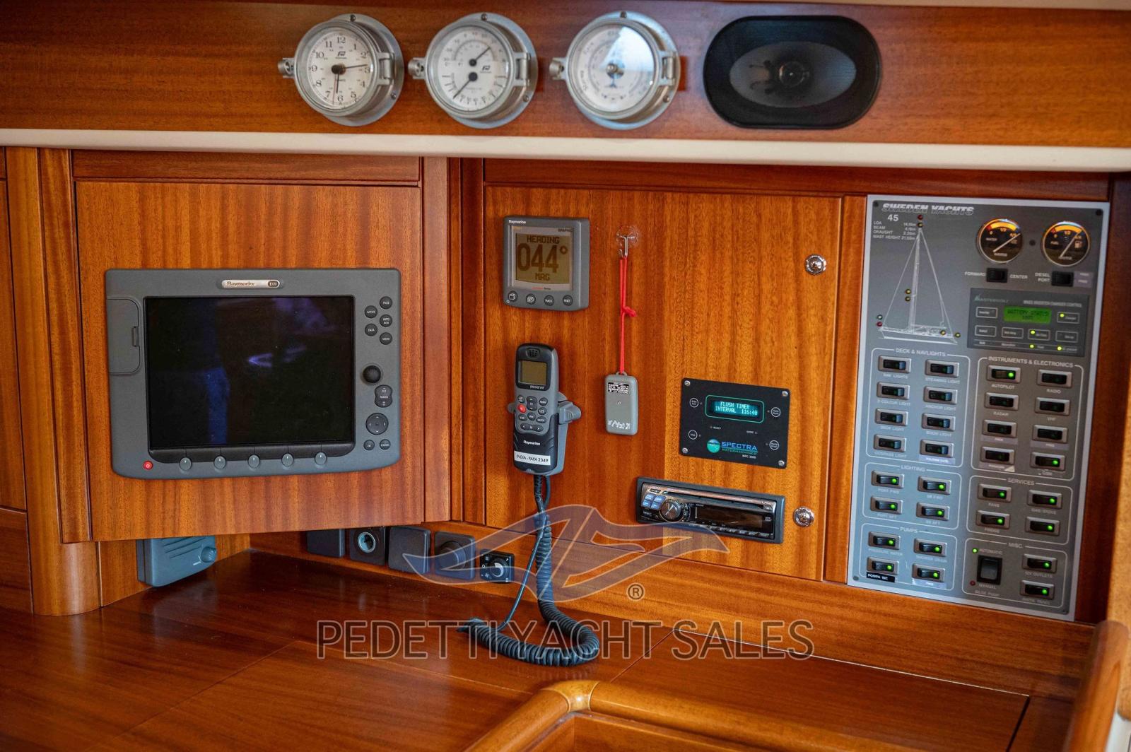 Ancre (Ultra 30 Kg con 80 mts catena 12mm), Eau sous pression, 5 Batteries, Passavant en teck, Douche de cockpit, Extincteur(s) fixe(s) (sala motore), Passerelle (manuale), Plateforme arrière (apertura elettrica), Pompe de cale automatique, Cockpit en teck, Prise de quai, Guindeau électrique (Lewmar), Gréement monotoron, Echelle de bain, table de cockpit, Annexe (Zodiac 2,60 chiglia rigida con 6hp Yamaha), 2 Winch (Andersen manuali), 4 Winch électrique (Andersen).