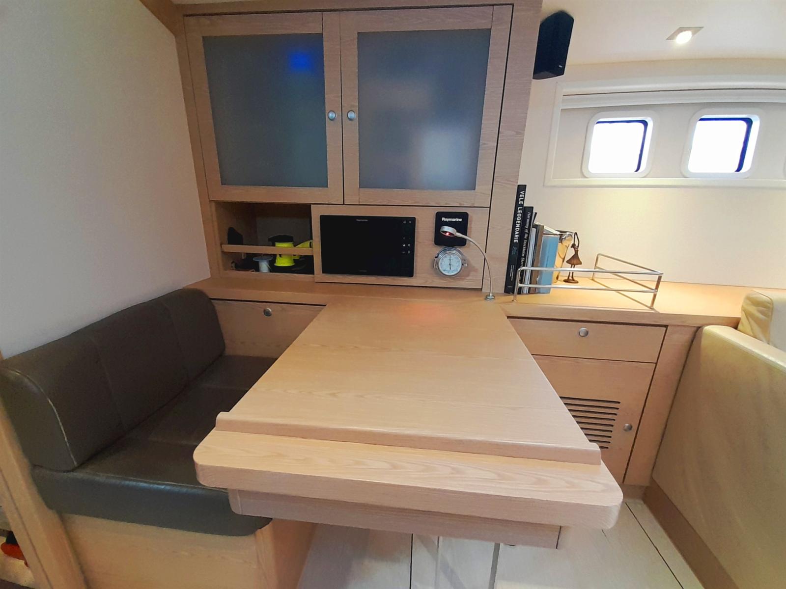 Canapé trois places à tribord avec meuble avec TV escamotable.