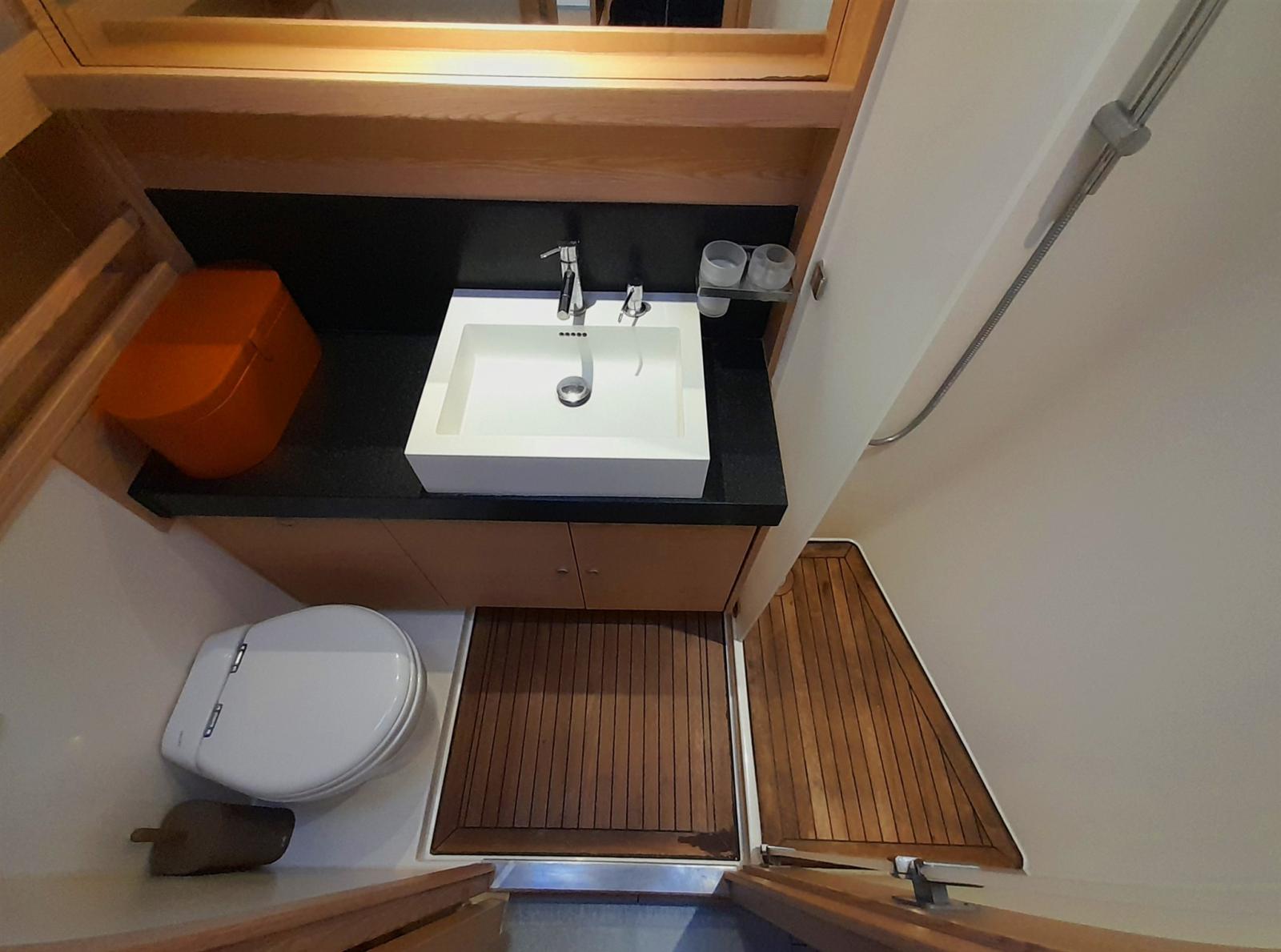 Cabine principale à l’avant avec salle de bain attenante avec douche séparée.