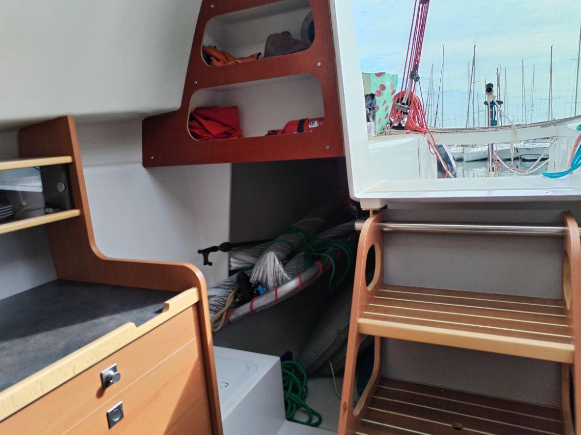 Cabine avant séparé avec rangements, couchette double sous le cockpit.
