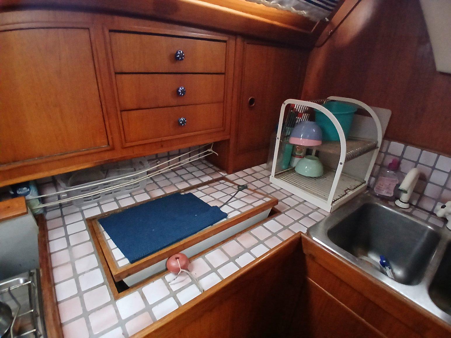 CONFORT : gazinière 2 feux + four, réfrigérateur, chauffe eau (usage moteur) eau sous pression pompes à pied eau de mer et douce, gainage chauffage en place, sellerie OK