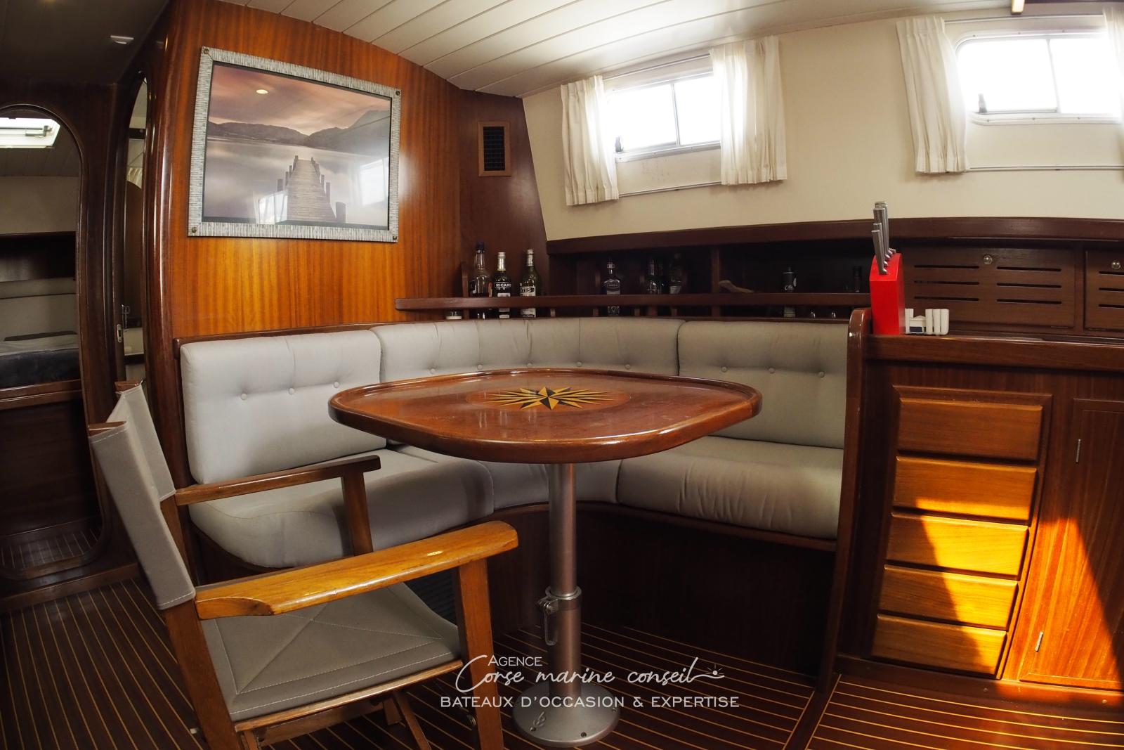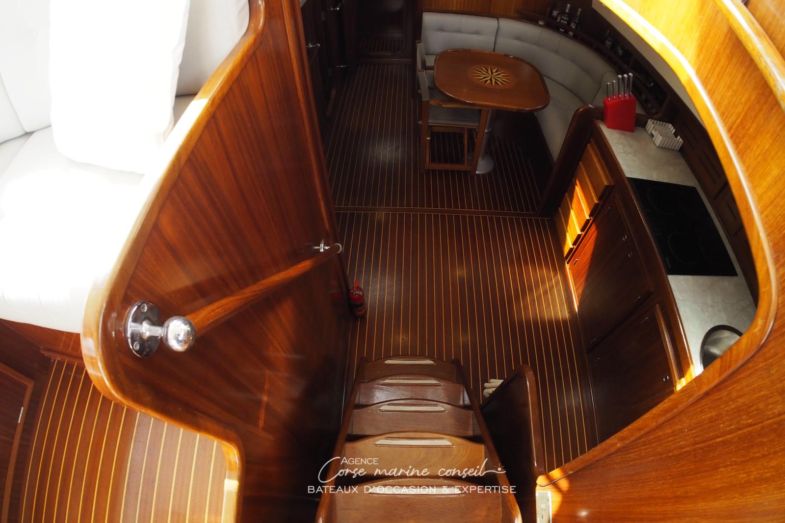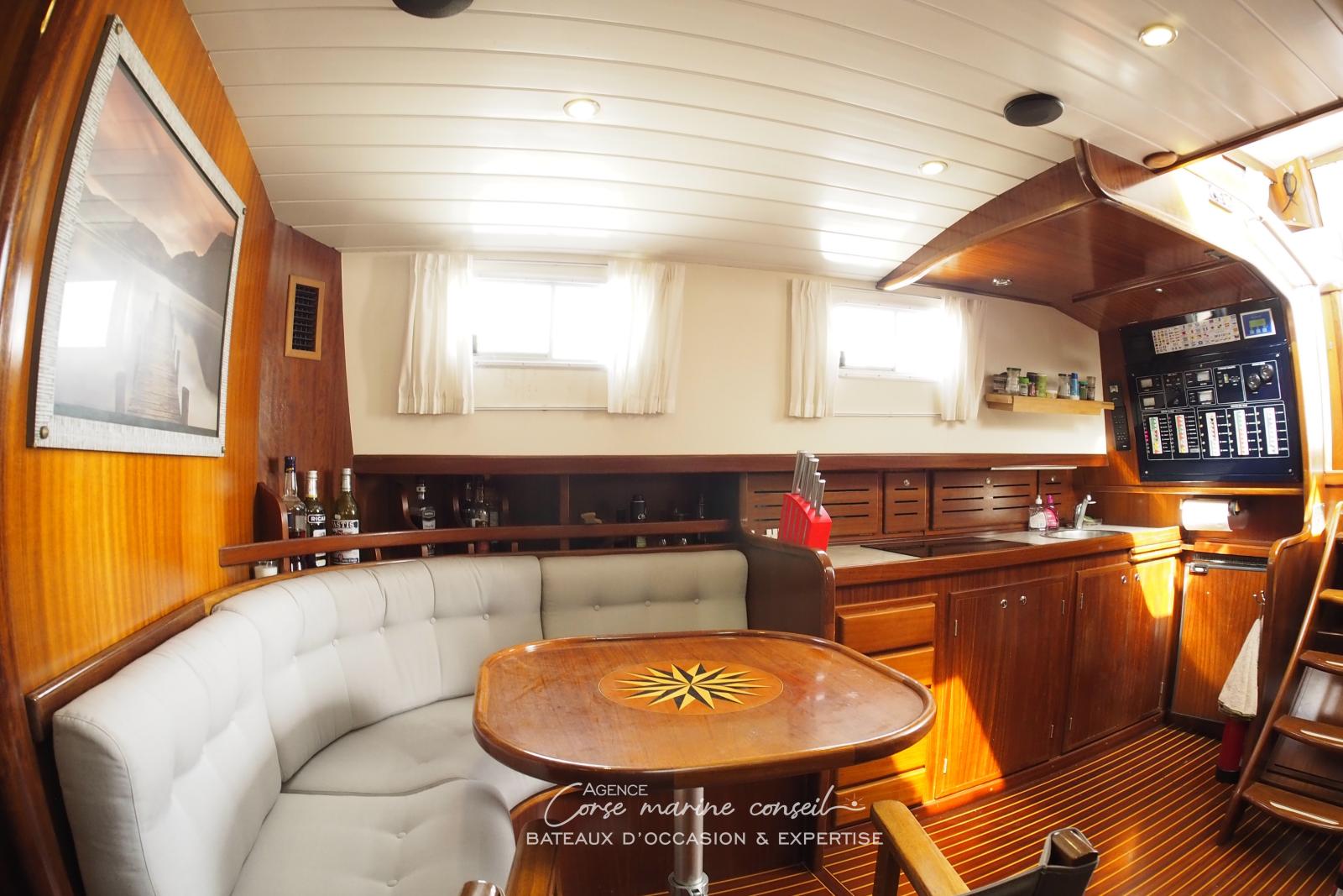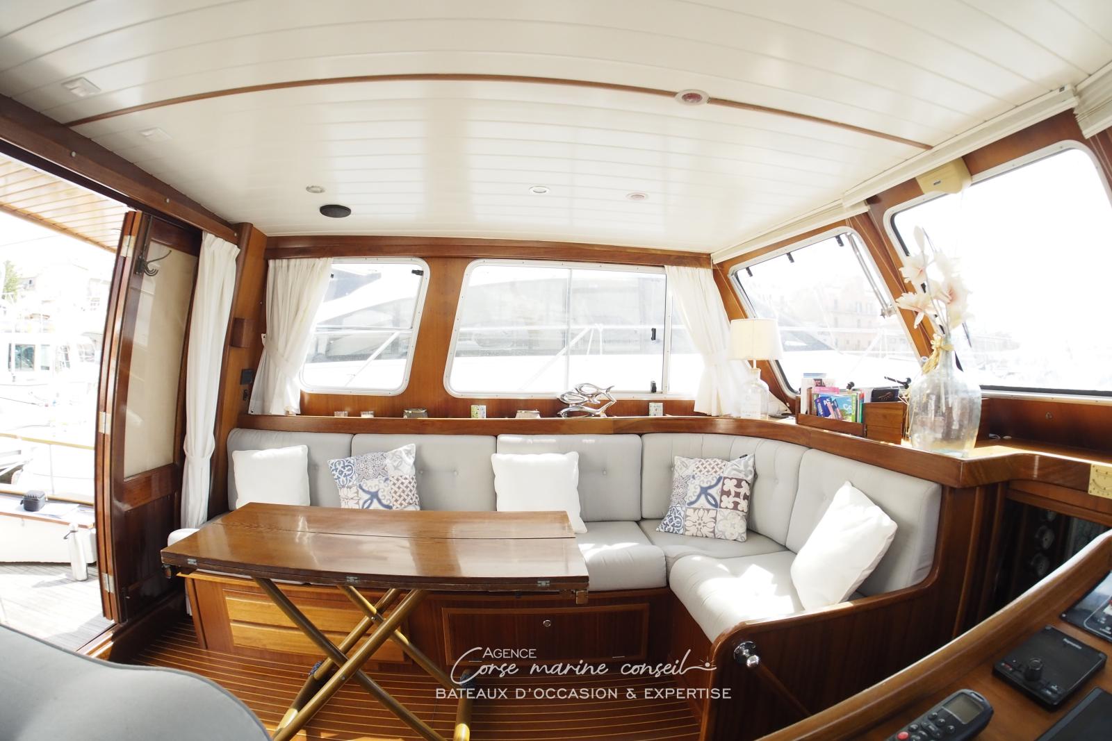 Salon de pont à bâbord, poste de pilotage à babord, kitchenette évier/ rangements/frigo 40L à tribord