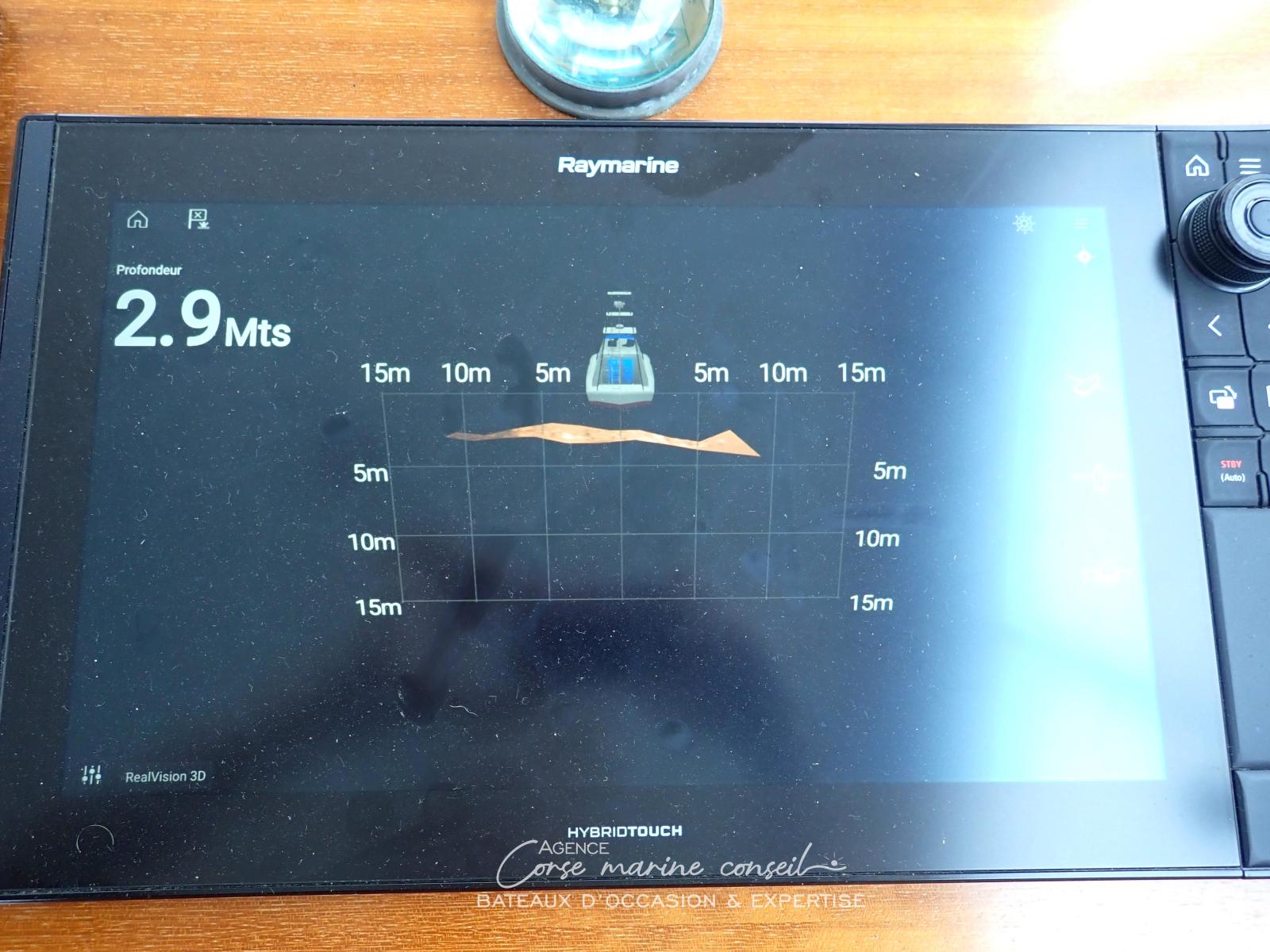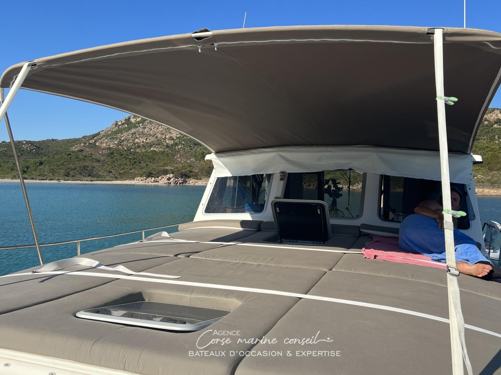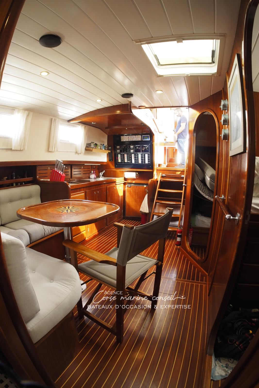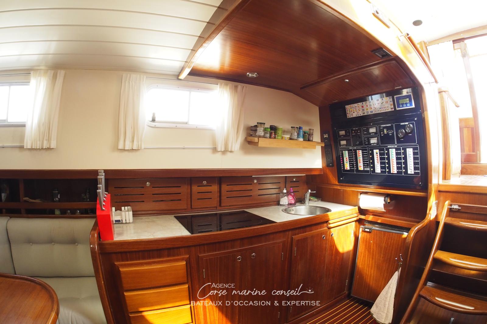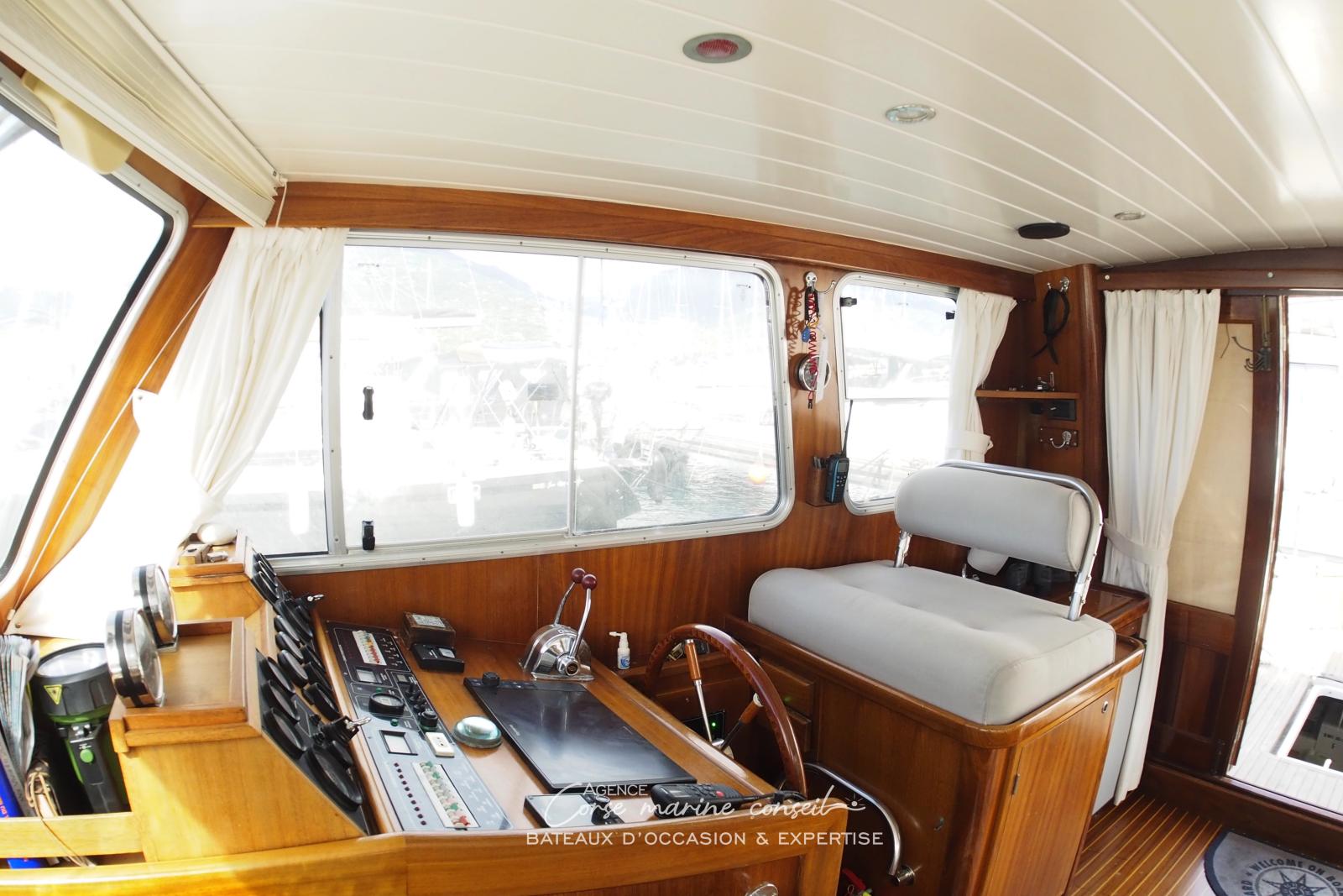 Salon de pont à bâbord, poste de pilotage à babord, kitchenette évier/ rangements/frigo 40L à tribord
