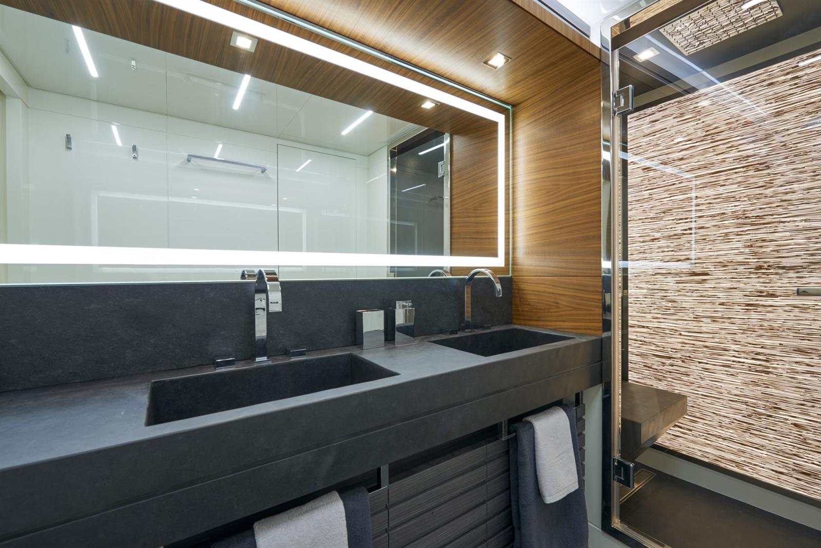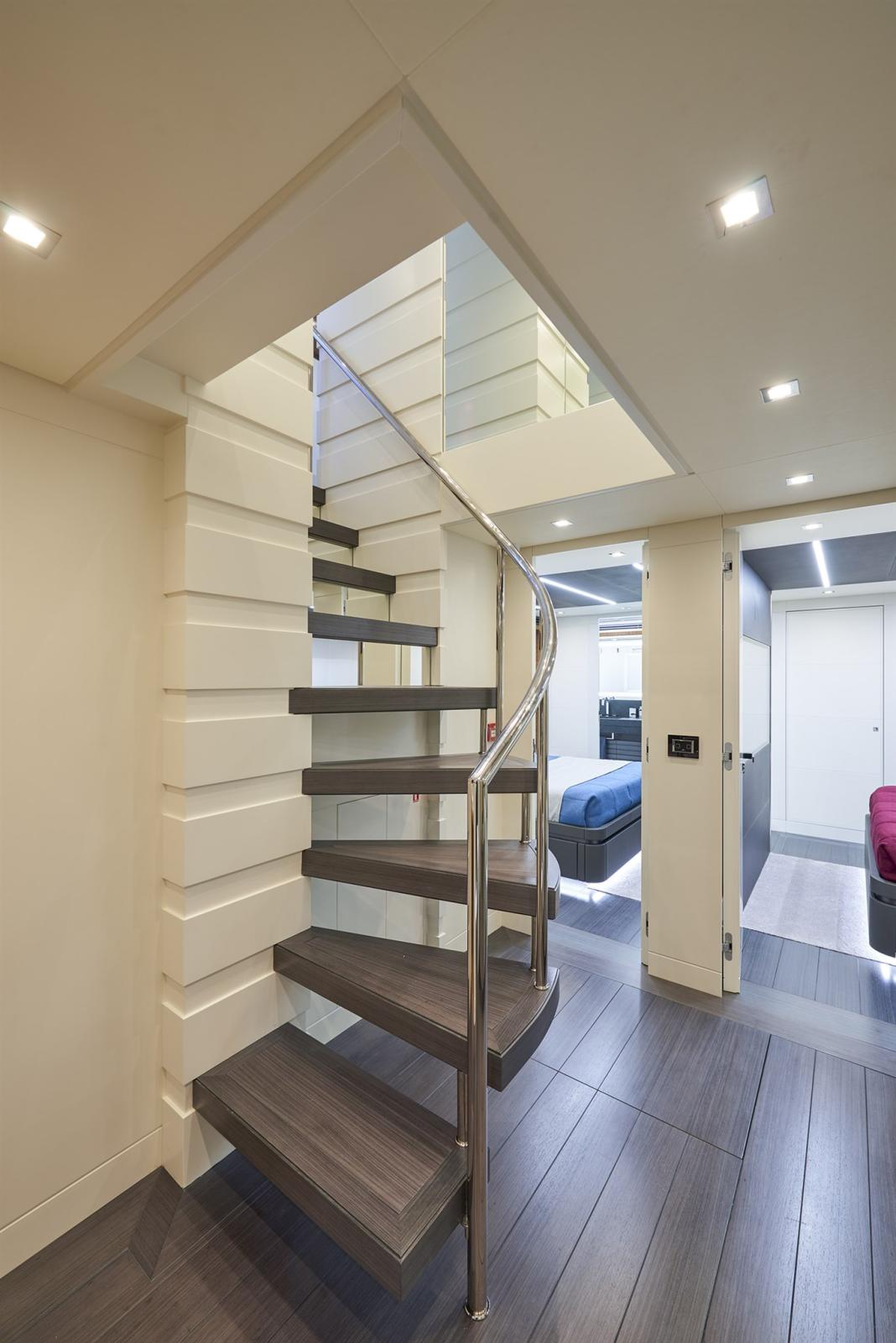Une particularité de ce modèle est certainement la suite propriétaire sur toute la largeur sur le pont supérieur à l’avant, tandis que les autres invités disposent de quatre cabines, dont des lits jumeaux et doubles, sur le pont inférieur. En ce qui concerne l’hébergement de l’équipage, il y a une zone à l’avant sous le pont composée de deux cabines doubles, de deux salles de bains et d’un grand couloir qui abrite les appareils de l’équipage.