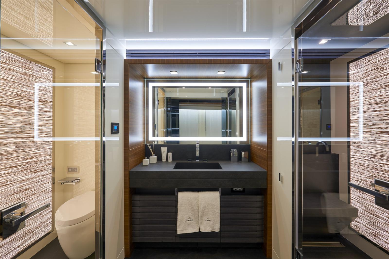 Quatre cabines, quatre salles de bains et une cabine d’équipage sur le pont inférieur - Salon, cuisine, salle à manger, salle de bain et cabine principale sur le pont principal - Poste de pilotage intérieur et extérieur sur le pont supérieur - Décoration De Luxe Astondoa - Contrôle manuel des stores dans le salon - Rideaux de cabine à commande manuelle - Plancher en bois sur le pont principal - Moquette pour les cabines - Equipement de cuisine : 2 réfrigérateurs, congélateur, four, plaque à induction, lave-vaisselle et lave-linge/sèche-linge - Appareils de l’équipage : réfrigérateur, micro-ondes et plaque à induction - Toilettes Tecma - Coffre-fort dans la cabine principale