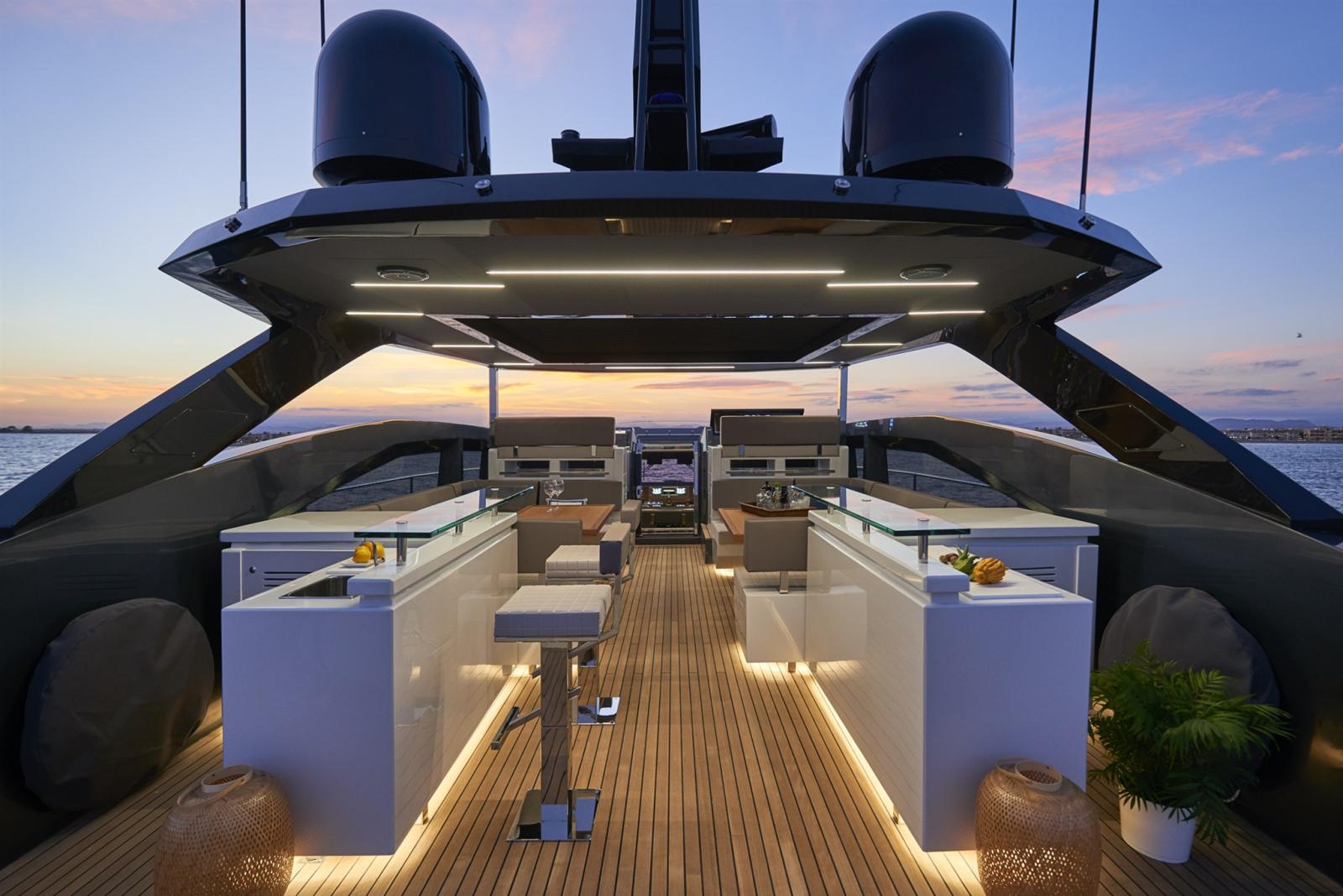 Propulseur d’étrave hydraulique - Volet - Projecteur - Poste de pilotage dans le cockpit arrière - Multi-écran 16 » dans le poste de pilotage (2) et le flybridge (2) - Antenne radar et pilote automatique - Récepteur AIS