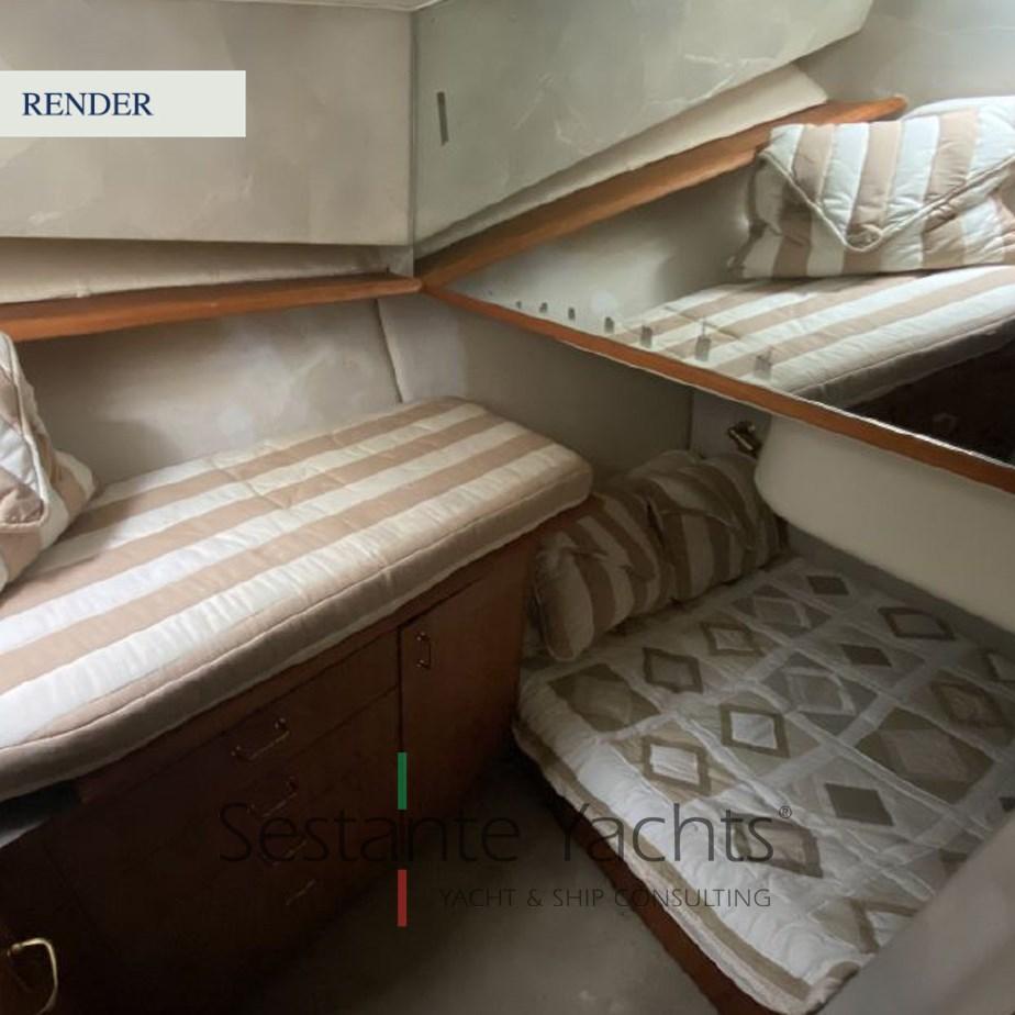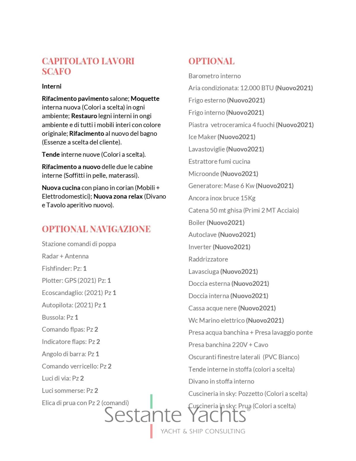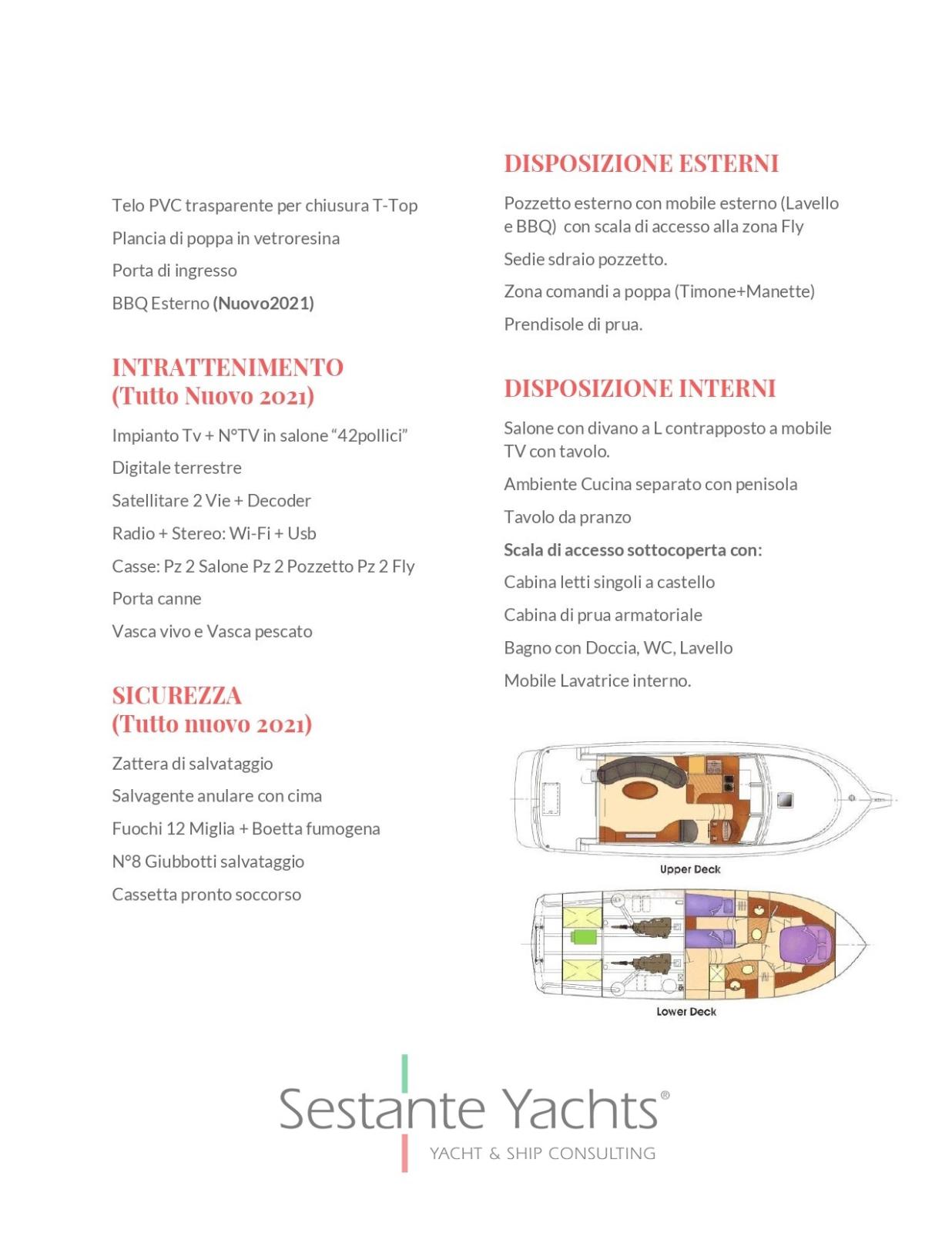Alarme moteur, Alarme de pompe de cale, Eau sous pression, 8 Batteries, Chargeur de batterie ((Nuovo 2021)), 2 Douche de cockpit ((Nuovo 2021)), Propulseur d'étrave ((Nuovo 2021)), Phares fixes arrière, Phare de poursuite, Flaps électriques, 6 Extincteur(s) fixe(s) (Estintori a mano), Indicateurs de flaps, 4 Éclairage de courtoisie (Solo nel pozzetto), 2 Spots sous-marins, Plateforme arrière (In vetroresina (Nuovo 2021)), 4 Pompe de cale automatique, Porte latérale, Cockpit en teck, Prise de quai, Connexion eau sous pression à quai, Onduleur, Guindeau électrique, Echelle de bain, Corne, Winch électrique avant.