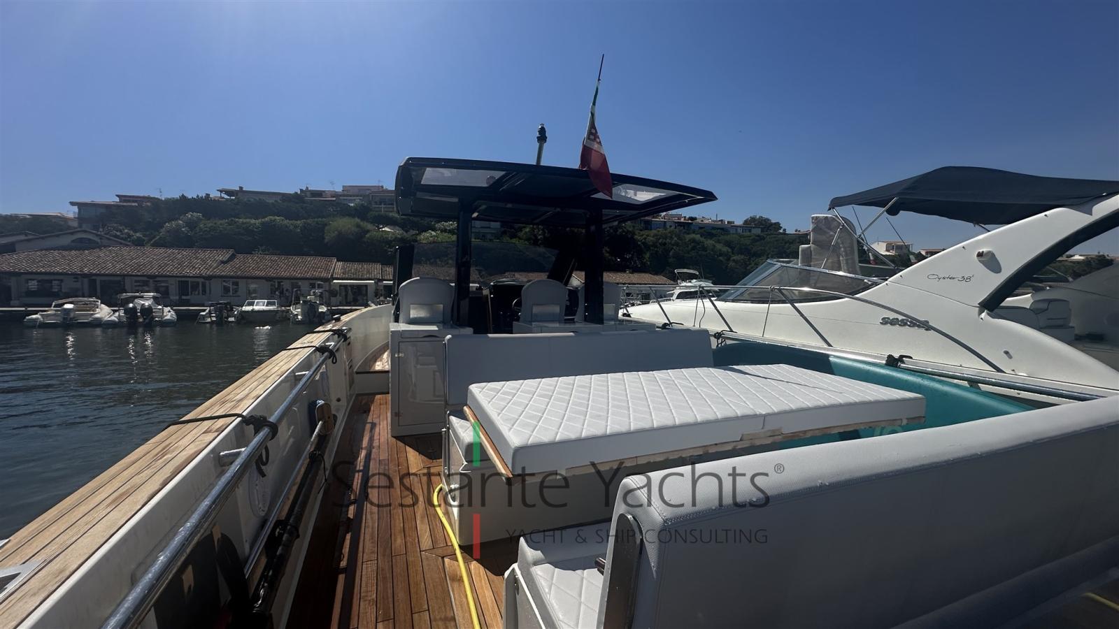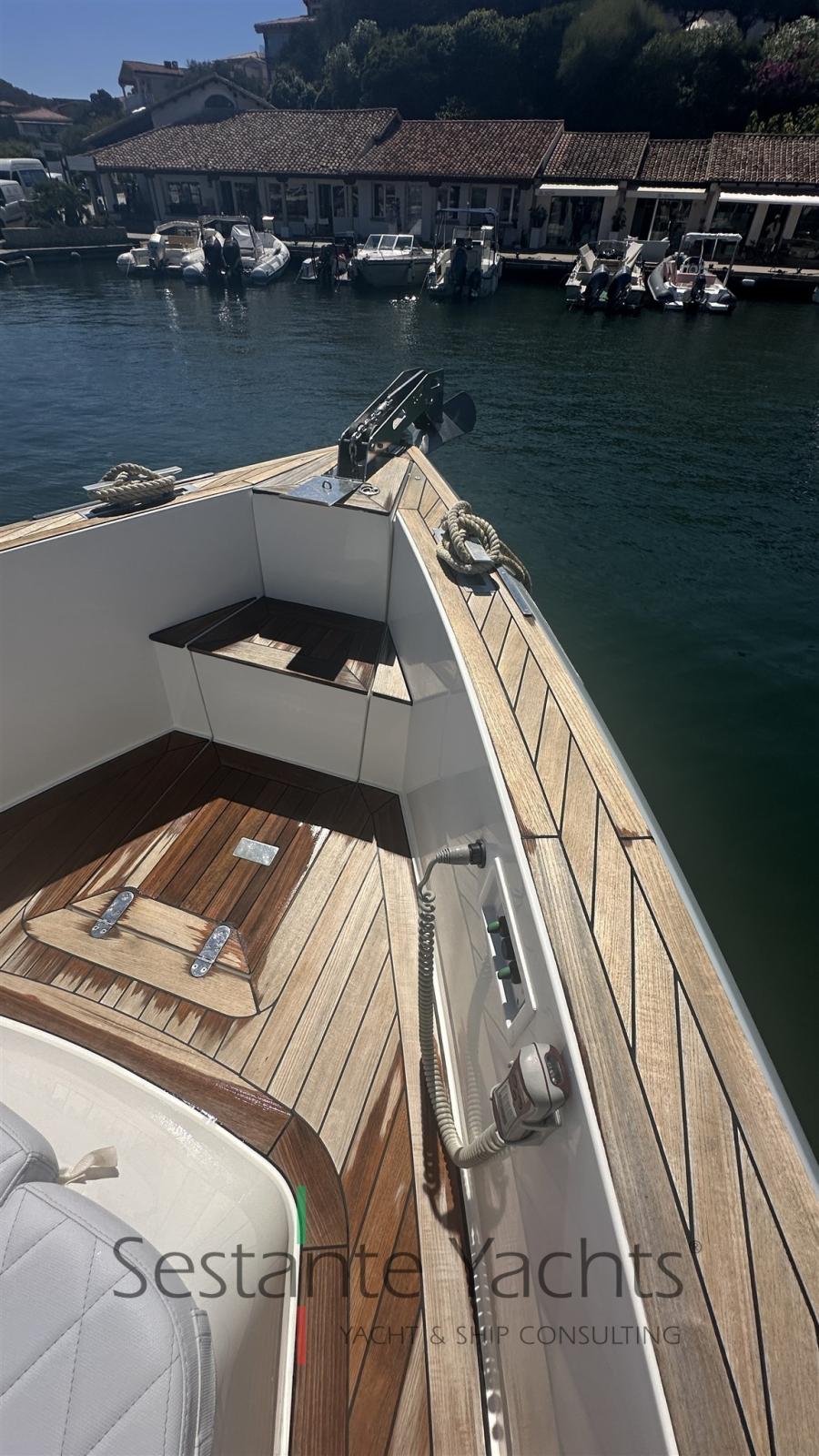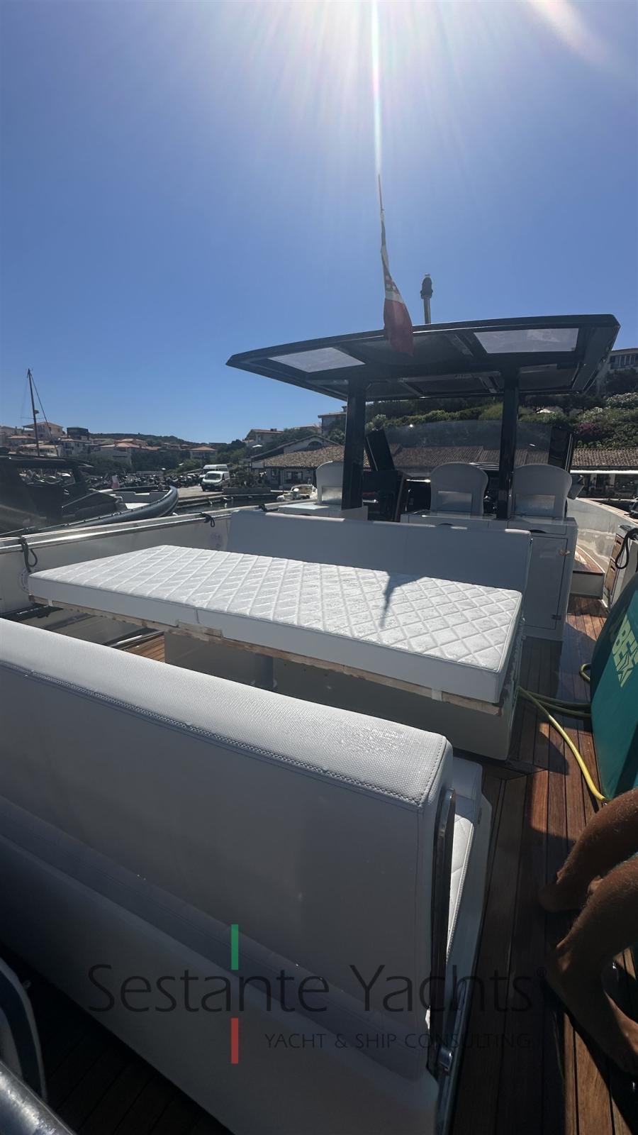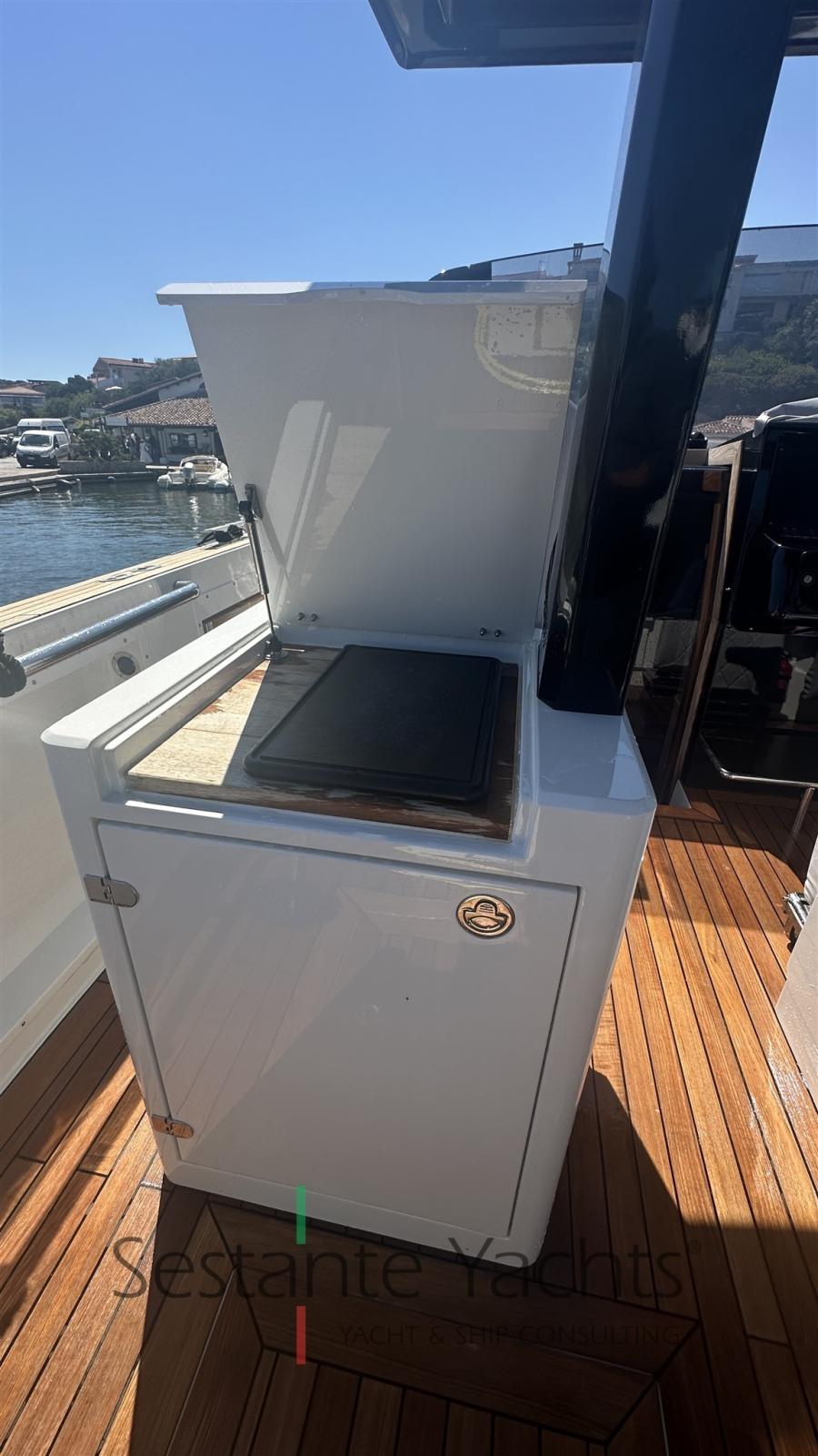 Alarme moteur, Alarme de pompe de cale, Ancre (10kg + 50m SS chain with hydraulic arm system), Eau sous pression, 6 Batteries (2x90 Ah (engines) + 4x160 Ah AGM (service)), Passavant en teck, Couleur spéciale (Grigio chiaro), Douche de cockpit, Flaps électriques (Volvo trim tabs), Hard top (Verniciatura 2024), Extincteur(s) fixe(s) (firebuoy), Lavabo dans le cockpit, Éclairage de courtoisie ((Option)), Plateforme arrière (extended and fixed), 2 Pompe de cale automatique, Pompe de cale manuelle, Porte latérale (sliding), Cockpit en teck, Prise de quai, Guindeau électrique, Echelle de bain, table de cockpit (on electric pedestal convetible into sunpad), Corne.