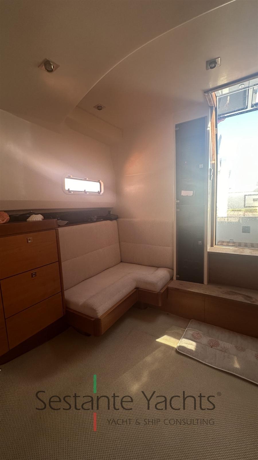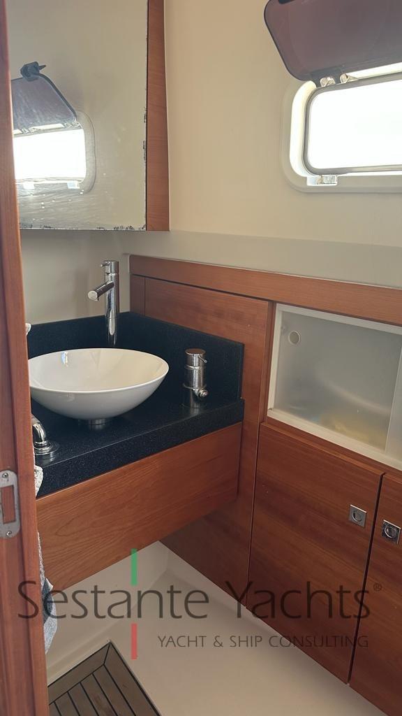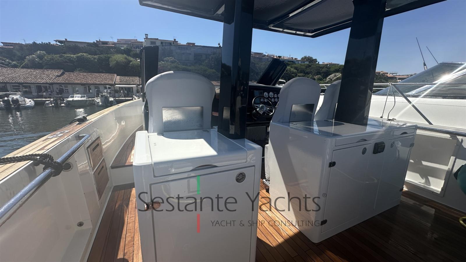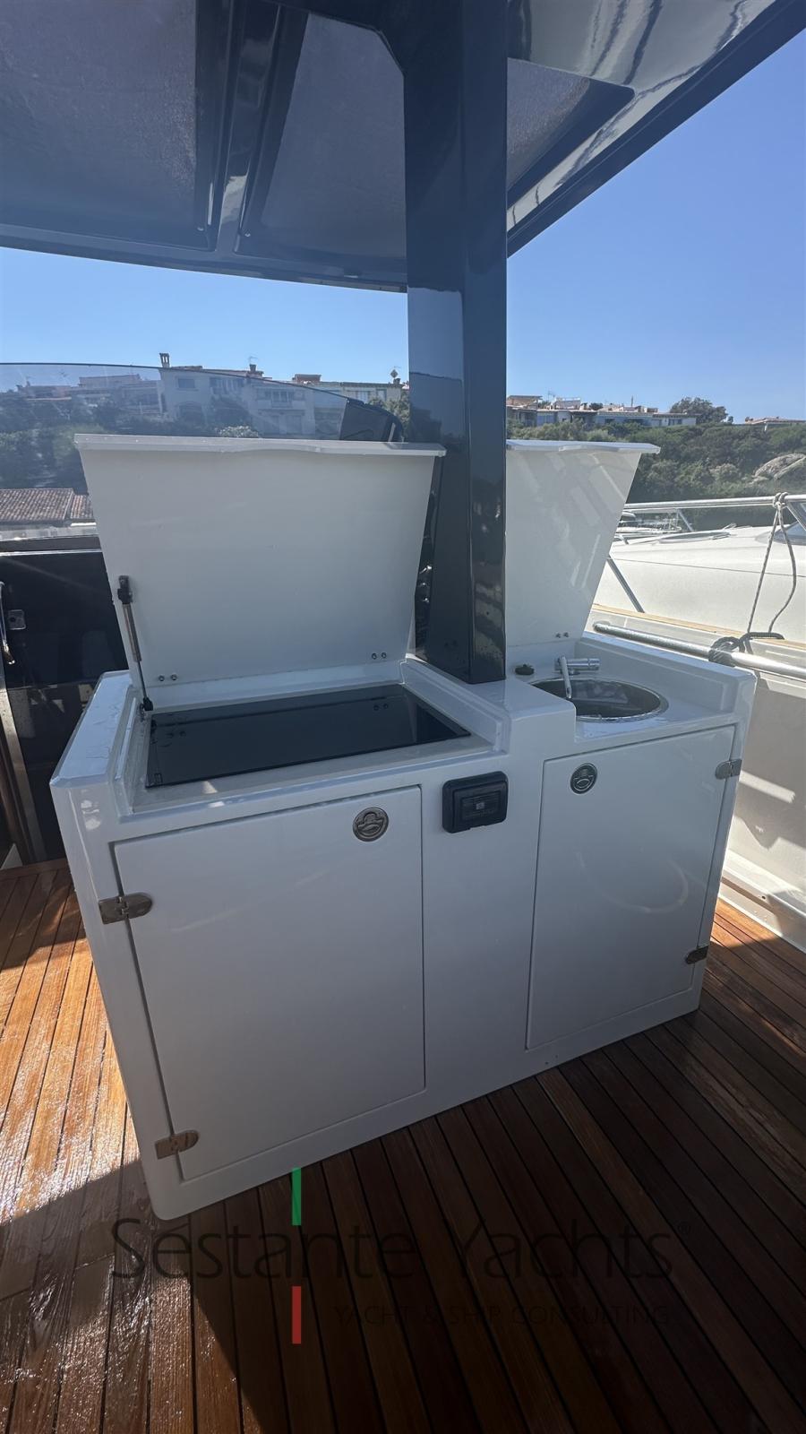 Alarme moteur, Alarme de pompe de cale, Ancre (10kg + 50m SS chain with hydraulic arm system), Eau sous pression, 6 Batteries (2x90 Ah (engines) + 4x160 Ah AGM (service)), Passavant en teck, Couleur spéciale (Grigio chiaro), Douche de cockpit, Flaps électriques (Volvo trim tabs), Hard top (Verniciatura 2024), Extincteur(s) fixe(s) (firebuoy), Lavabo dans le cockpit, Éclairage de courtoisie ((Option)), Plateforme arrière (extended and fixed), 2 Pompe de cale automatique, Pompe de cale manuelle, Porte latérale (sliding), Cockpit en teck, Prise de quai, Guindeau électrique, Echelle de bain, table de cockpit (on electric pedestal convetible into sunpad), Corne.