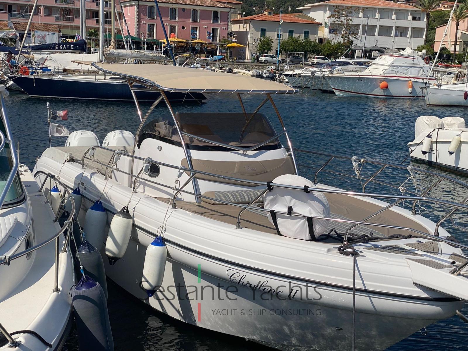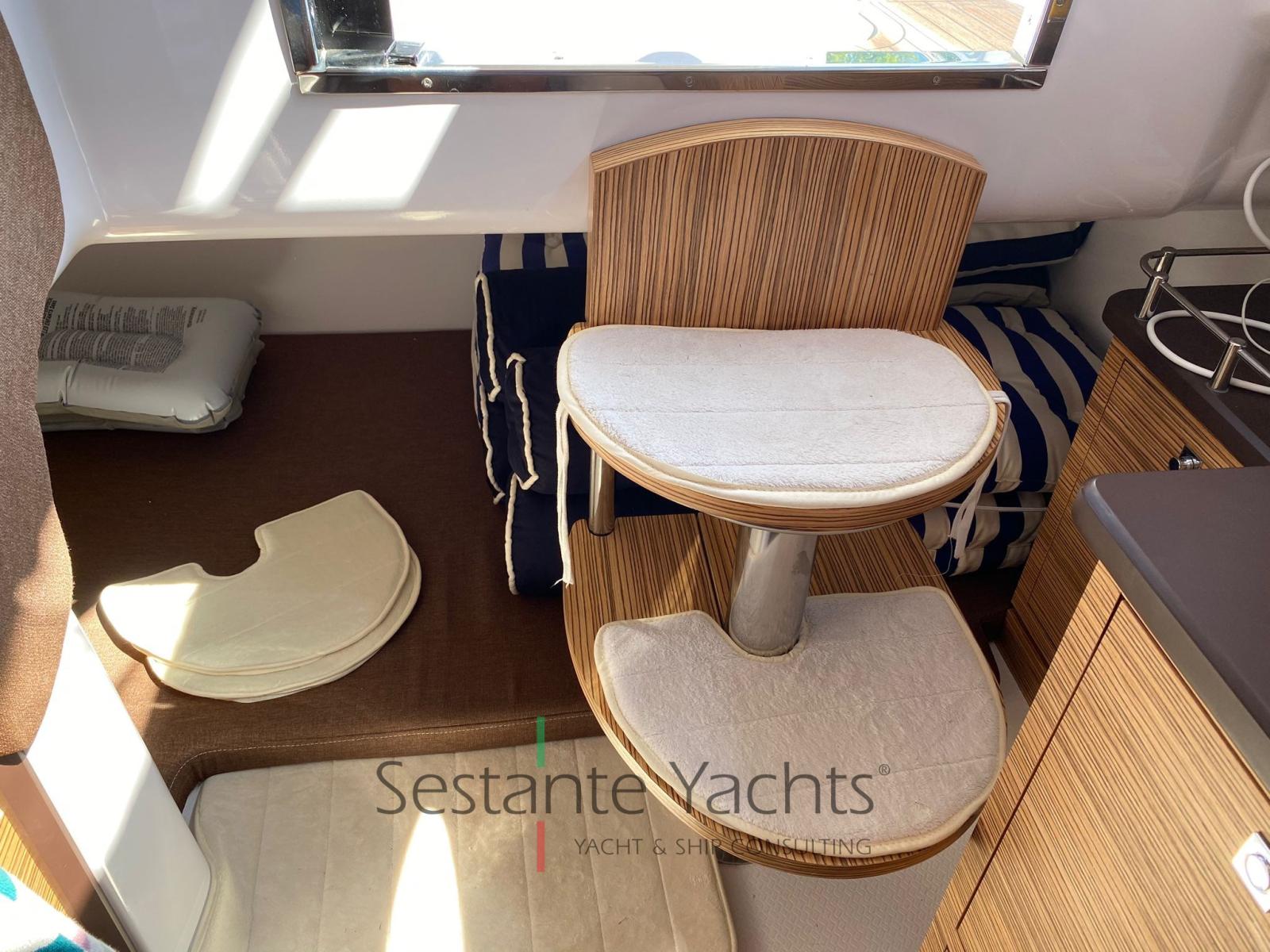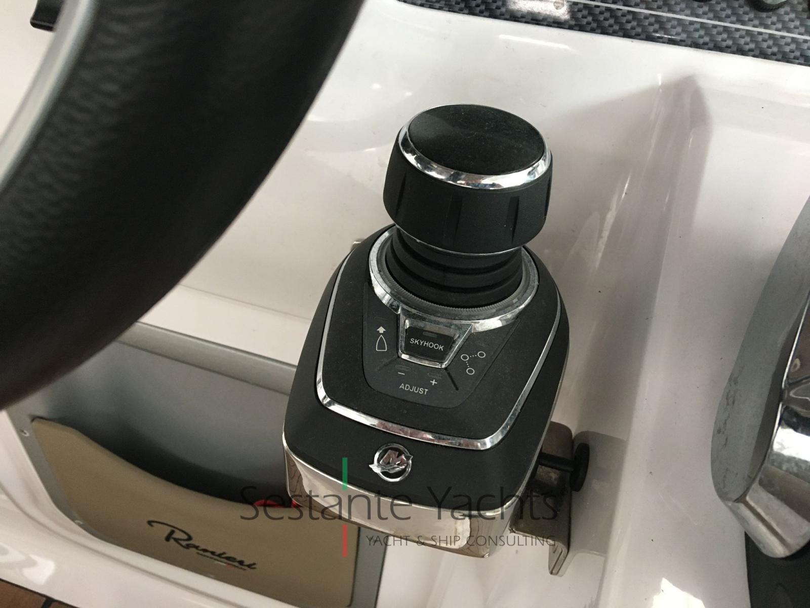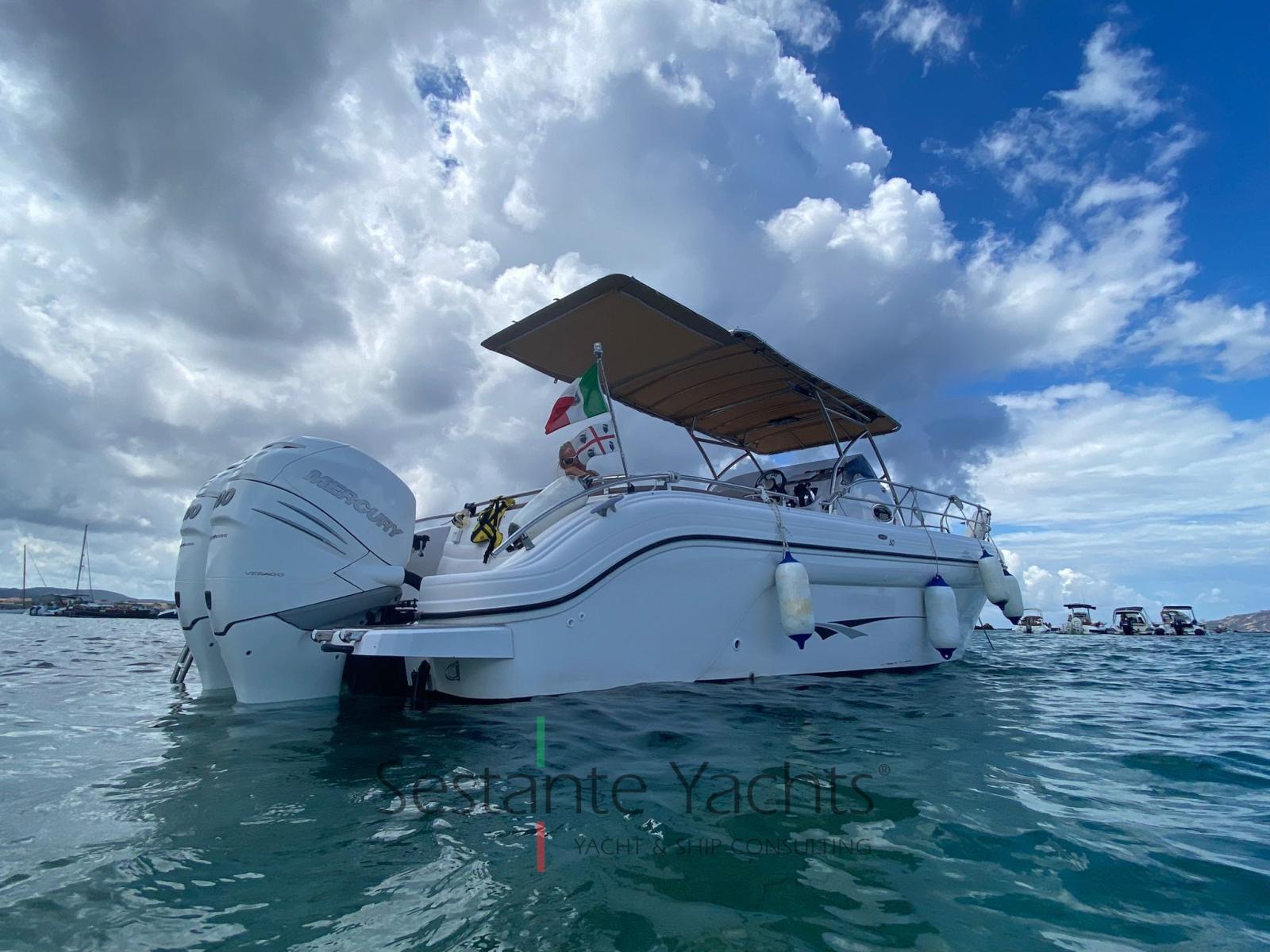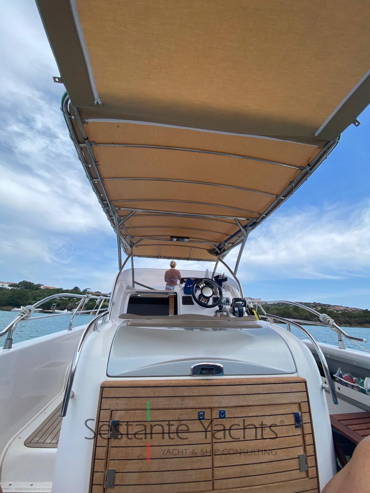 Alarme moteur, Eau sous pression, Trim hydraulique, 3 Batteries, Passavant en teck, Douche de cockpit, Flaps électriques, Lavabo dans le cockpit, Éclairage de courtoisie, Pompe de cale automatique, Prise de quai, Guindeau électrique, Echelle de bain, table de cockpit, Corne, T-Top (Con prolunga tendalino).