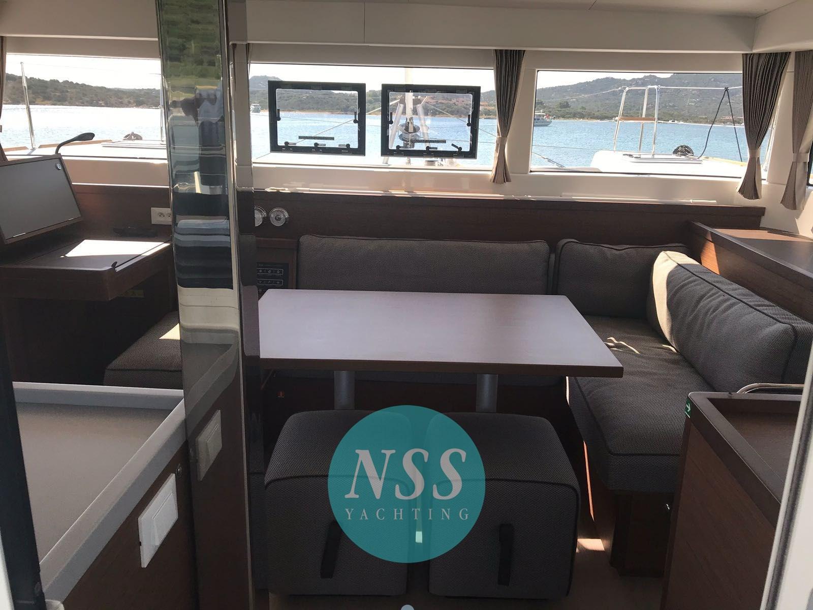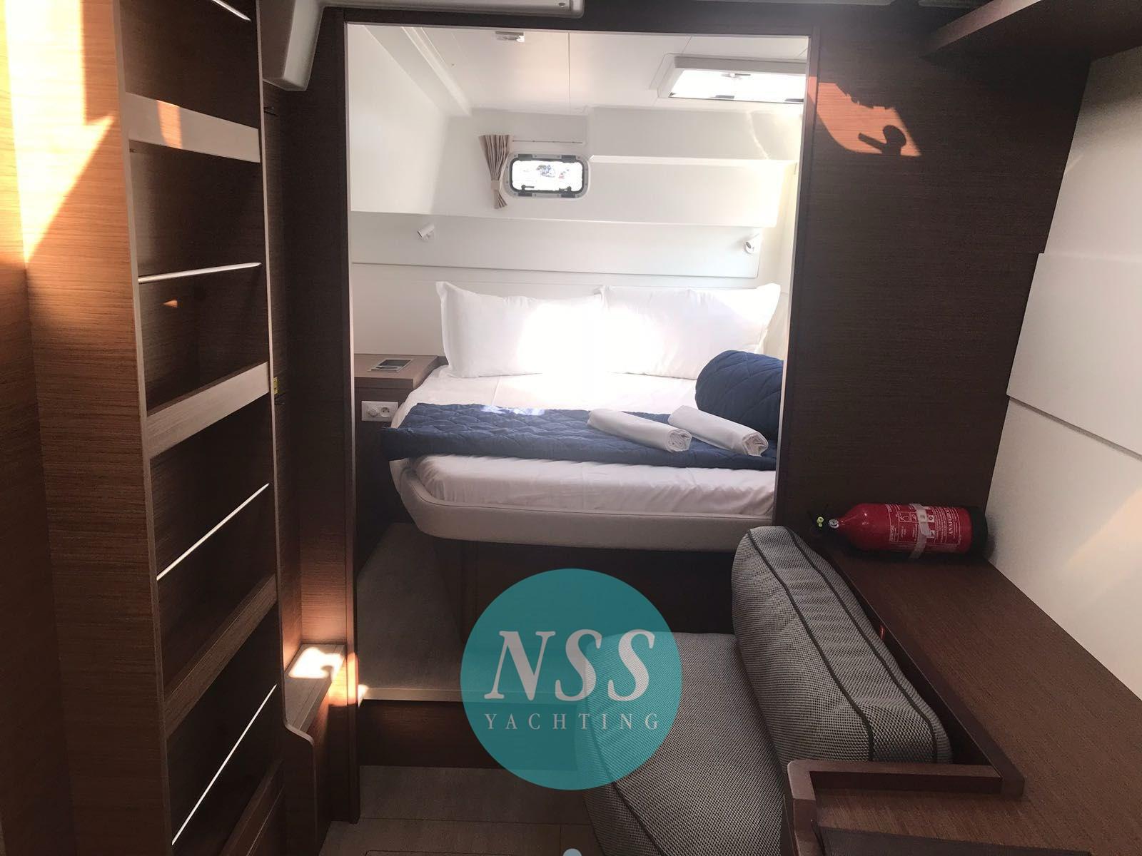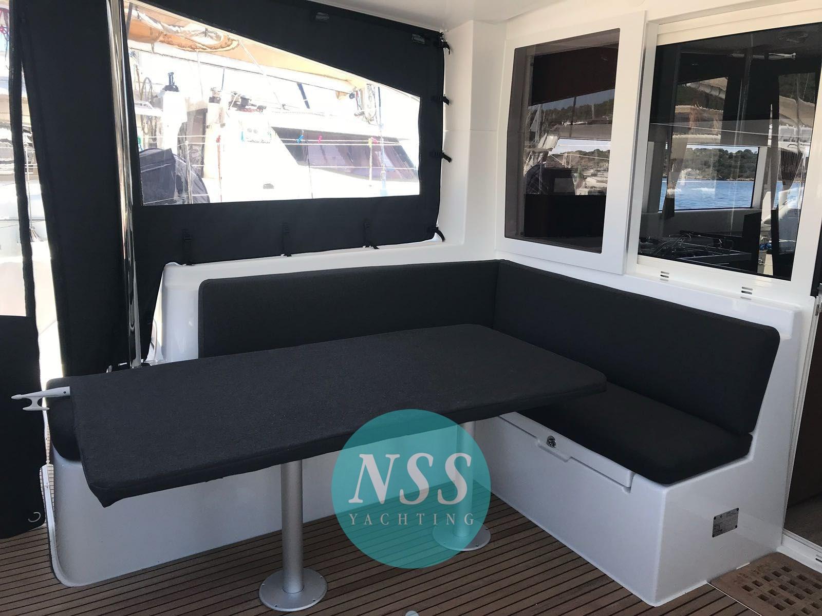 Lagoon 40, VERSION PROPRIÉTAIRE (trois cabines, deux salles de bain, plus des cabines extérieures pour l’équipage et une cabine à manger décapotable) ; prêt à bouée et en option : version gamme Comfort and Elegance, dépeilleur, treuil électrique, coussins complets, commande de guindeau dans la timonerie, teck dans le cockpit, pompe à eau de mer, grande table de cockpit avec couvercle, moteurs surdimensionnés de 45 ch, réservoir d’eau supplémentaire, onduleur, micro-ondes, réfrigérateur supplémentaire, ventilateurs, antenne TV, AIS, radar, passerelle carbone, sondeur avant B&G, télécommande pilote automatique, nouveau filet d’étrave, chaîne encore nouvelle...