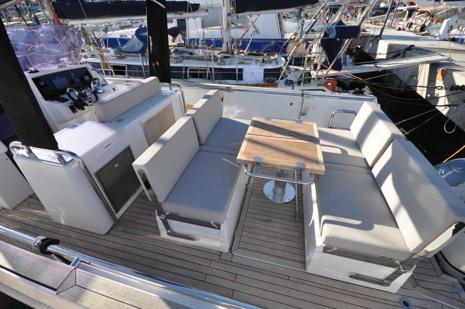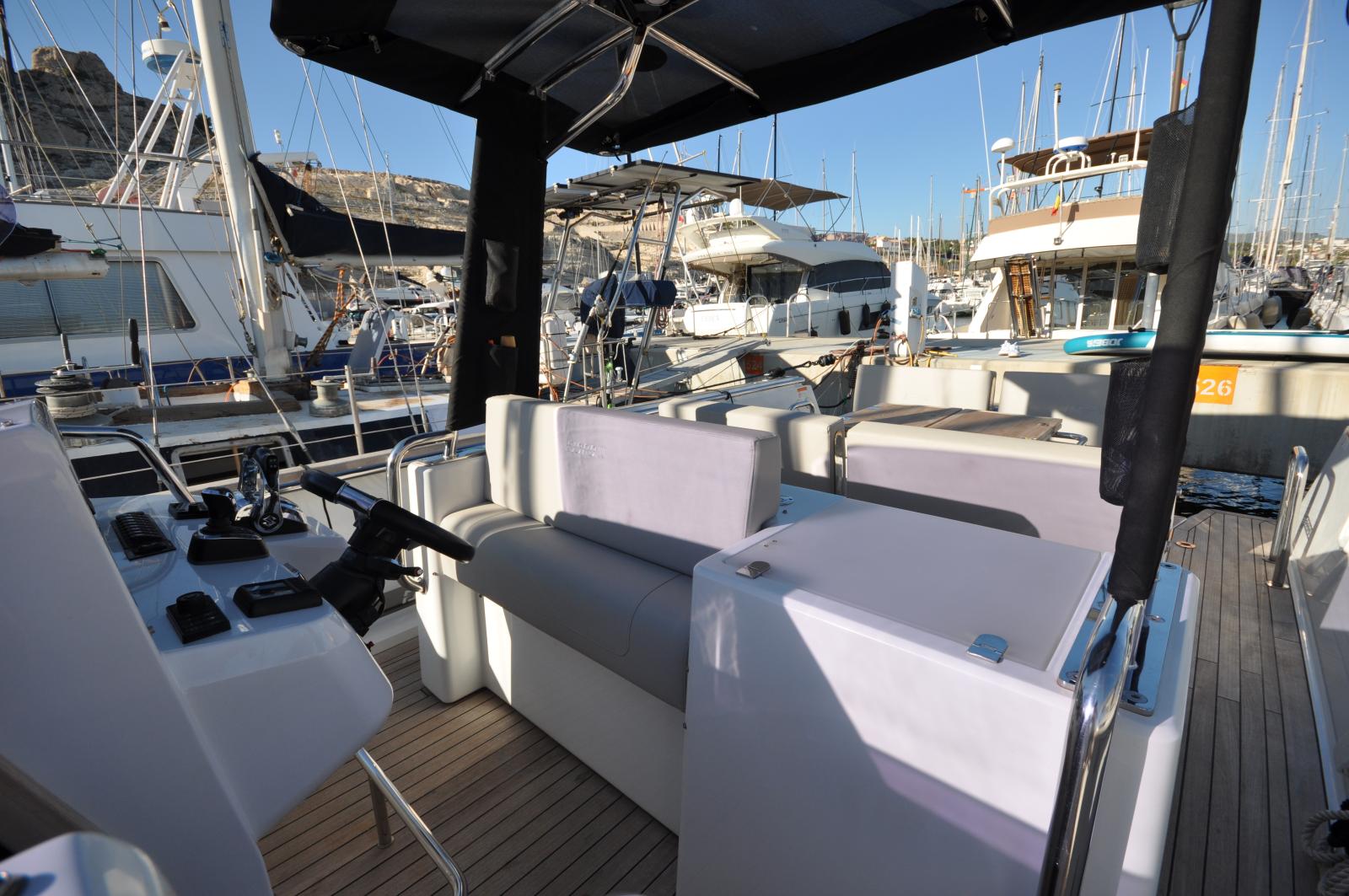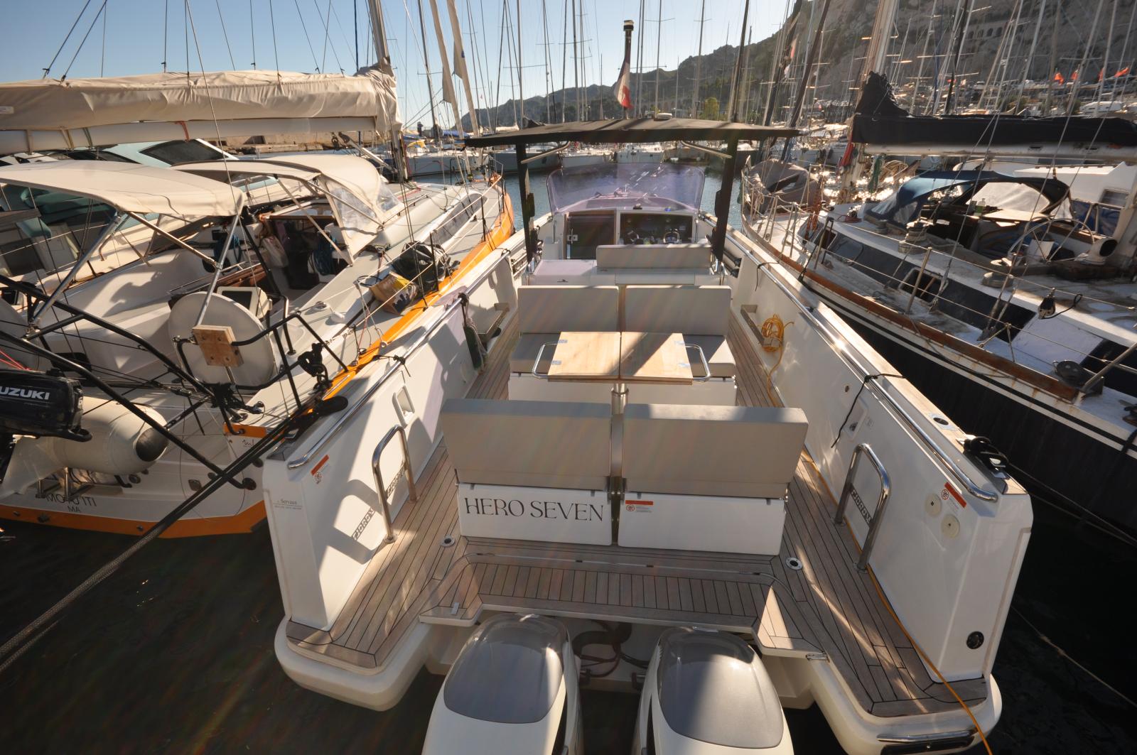 Son design moderne se distingue par un pont spacieux en teck, de larges solariums avant et arrière, un T-Top protecteur, ainsi qu’un cockpit convivial avec table, réfrigérateur et cuisine extérieure. L’intérieur propose une cabine confortable avec couchages et une salle d’eau avec douche séparée.