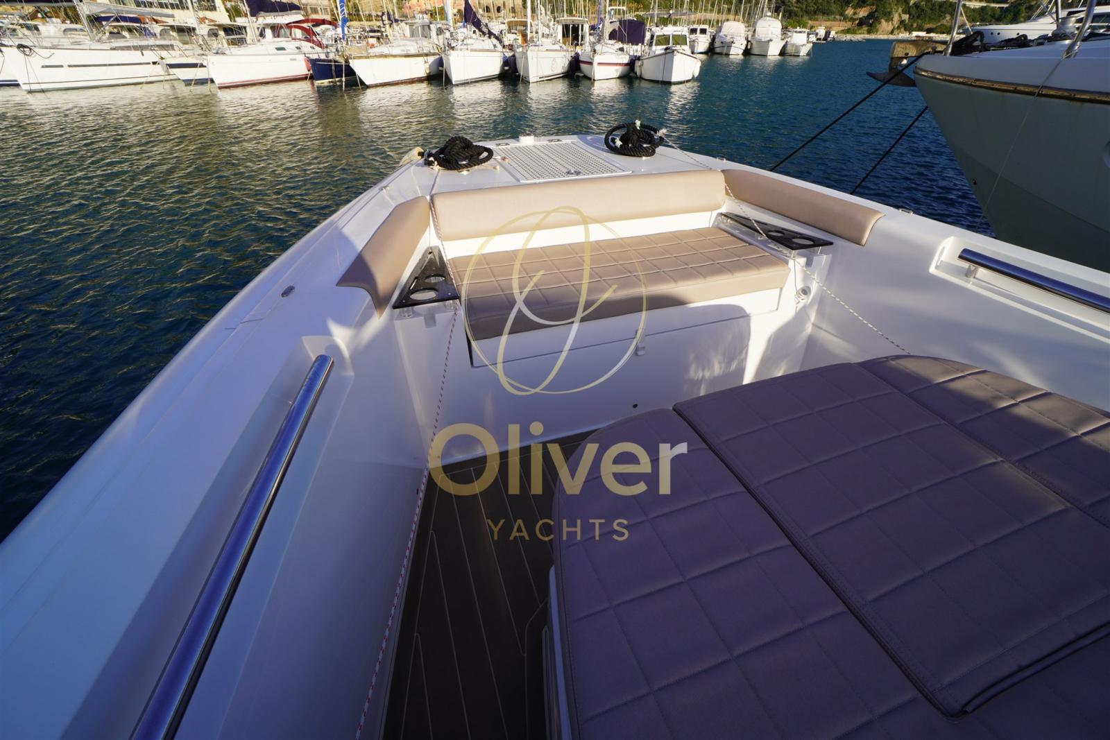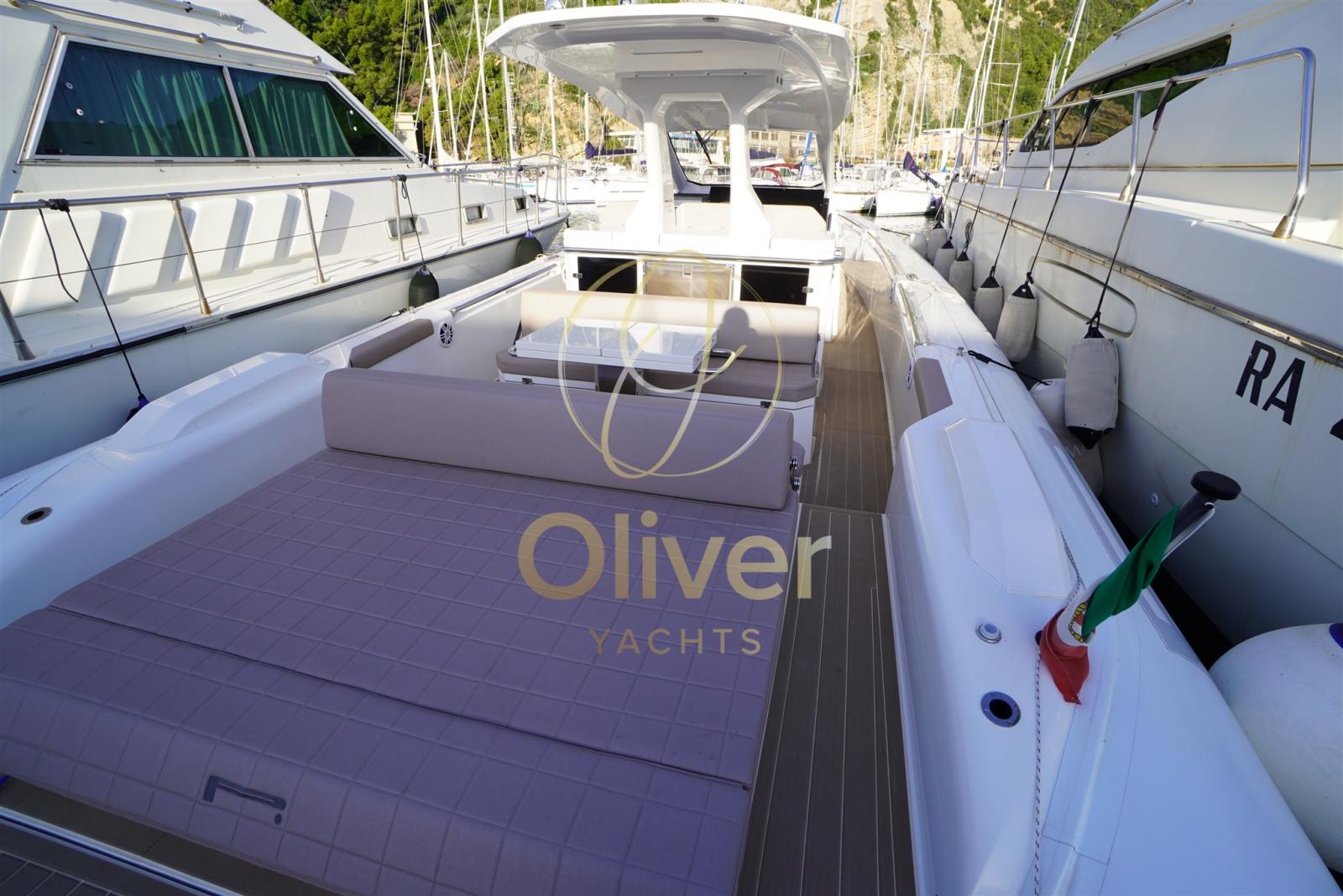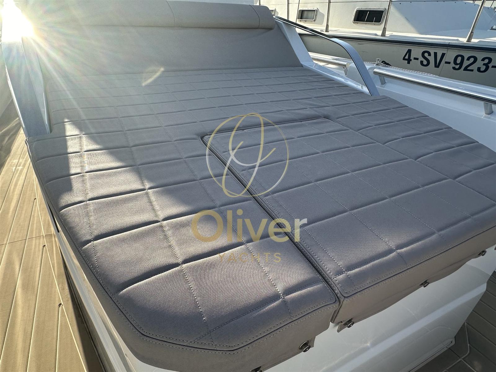 À bord, les espaces ont été optimisés pour un maximum de confort. Le pont principal se caractérise par deux grands bains de soleil, un à l’avant et un à l’arrière convertible en sièges pour la dînette, des zones conviviales équipées de sièges ergonomiques, d’un évier externe, d’un double réfrigérateur, idéal pour recevoir des invités et profiter du soleil et de la mer.
