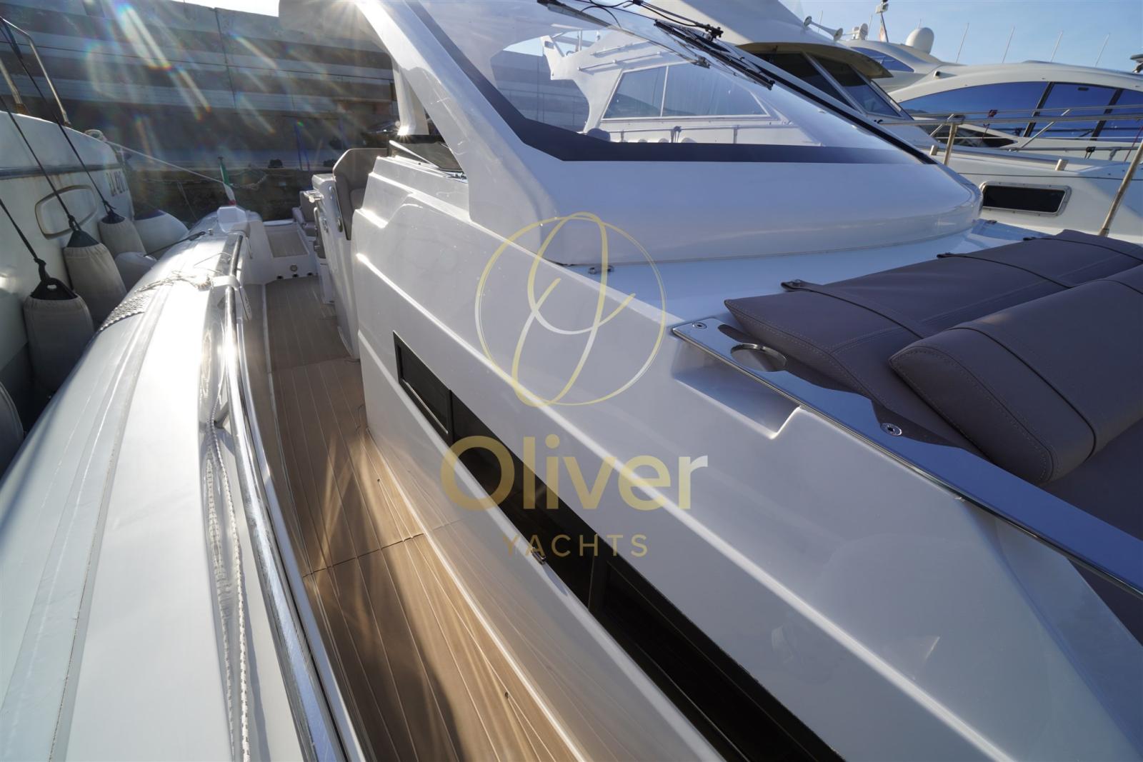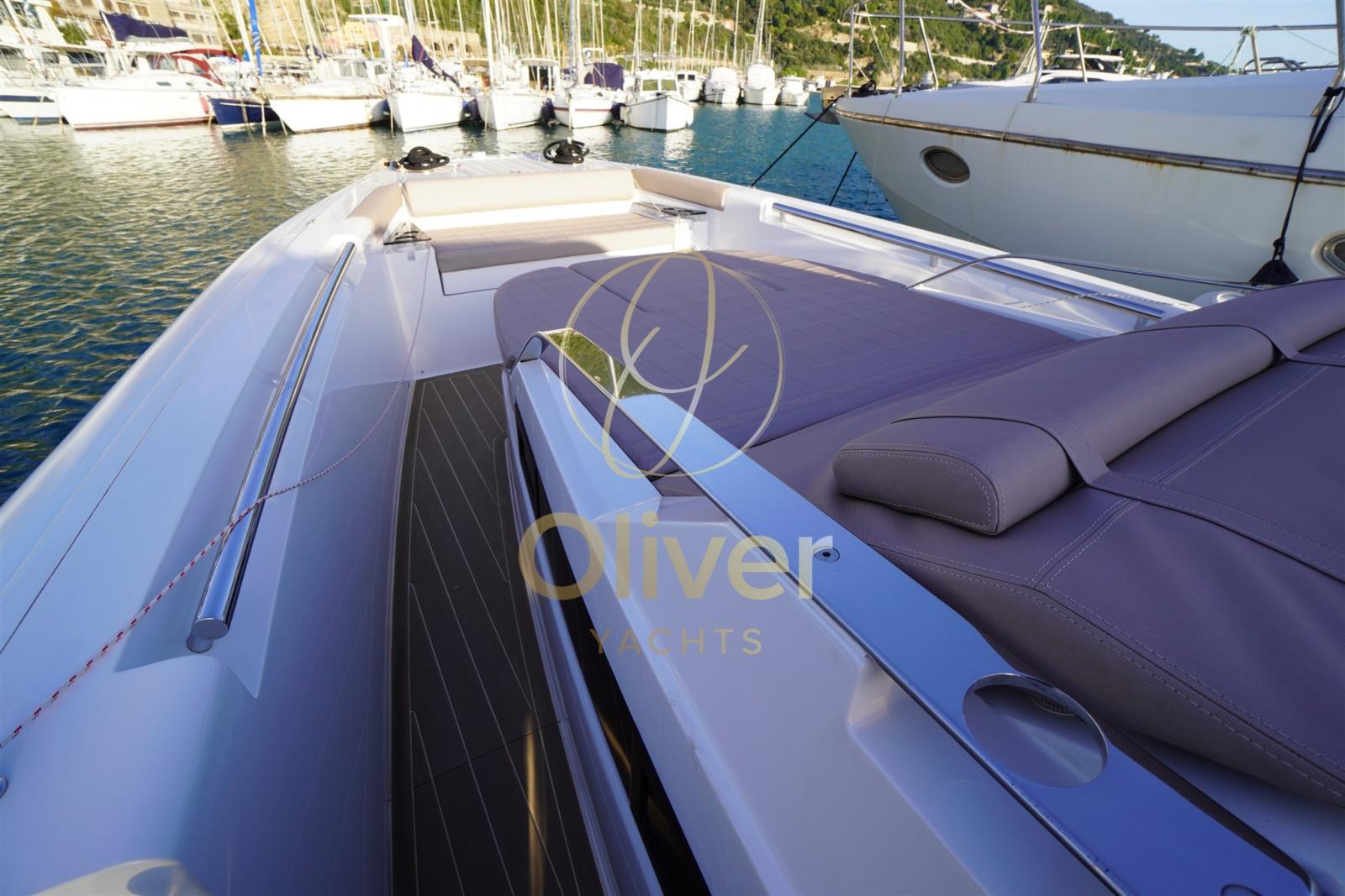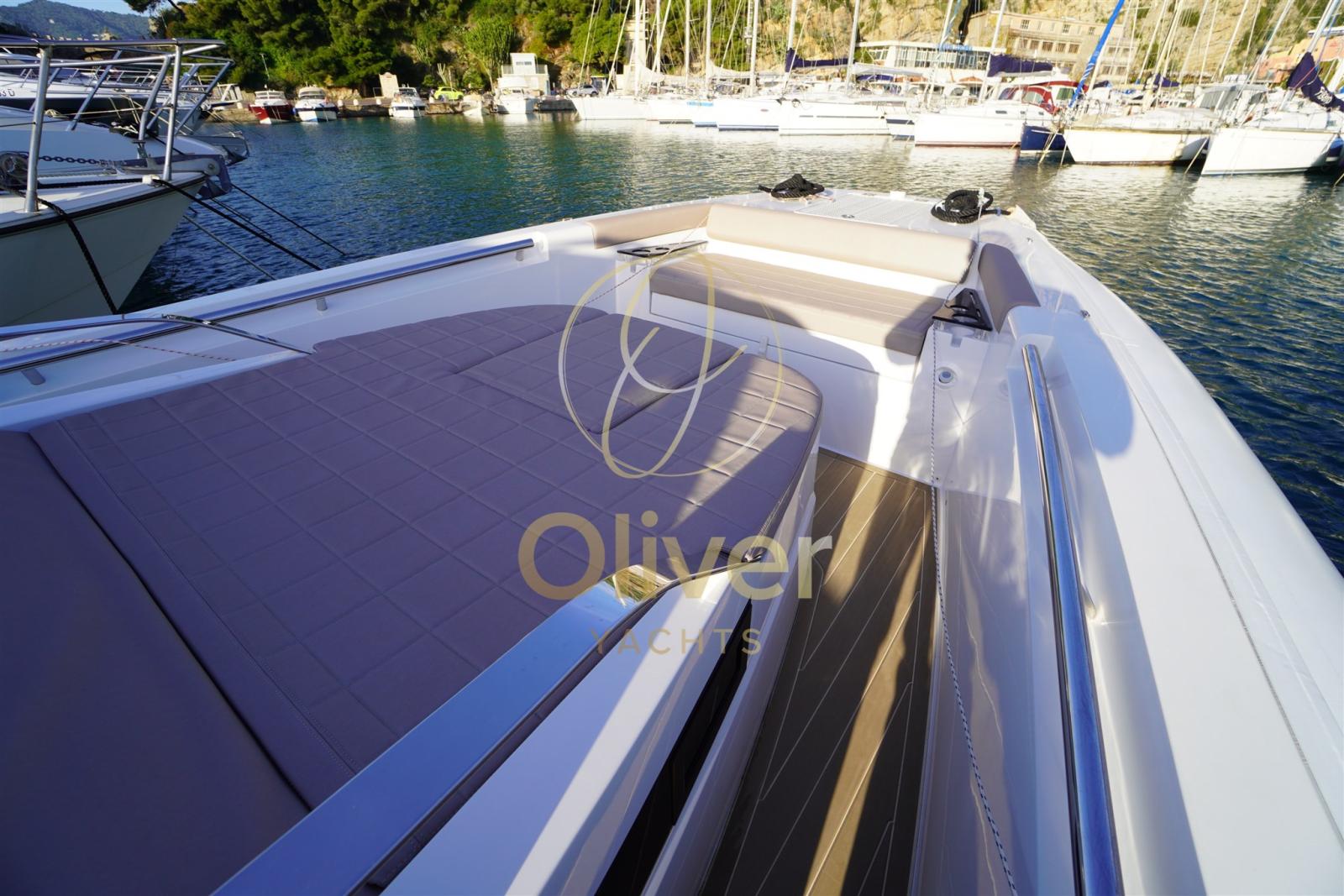 À bord, les espaces ont été optimisés pour un maximum de confort. Le pont principal se caractérise par deux grands bains de soleil, un à l’avant et un à l’arrière convertible en sièges pour la dînette, des zones conviviales équipées de sièges ergonomiques, d’un évier externe, d’un double réfrigérateur, idéal pour recevoir des invités et profiter du soleil et de la mer.