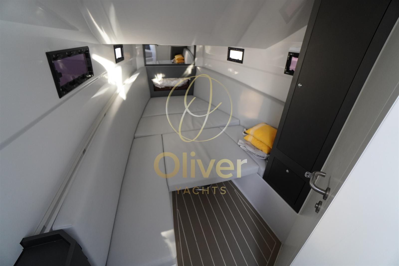 L’espace sous le pont a été personnalisé avec la cabine avant avec un lit double qui peut être converti en V sur la proue et une salle de bain séparée (en option)