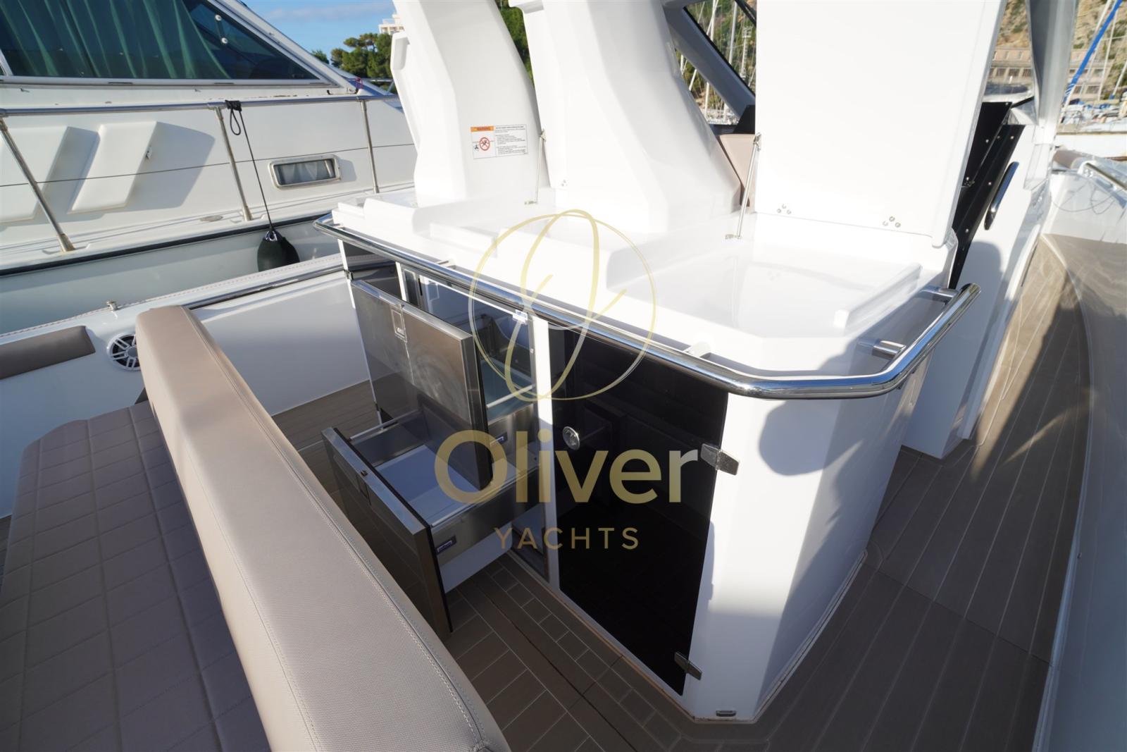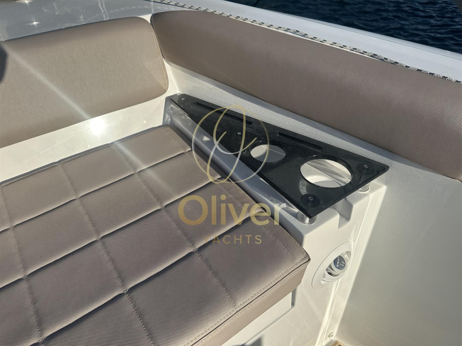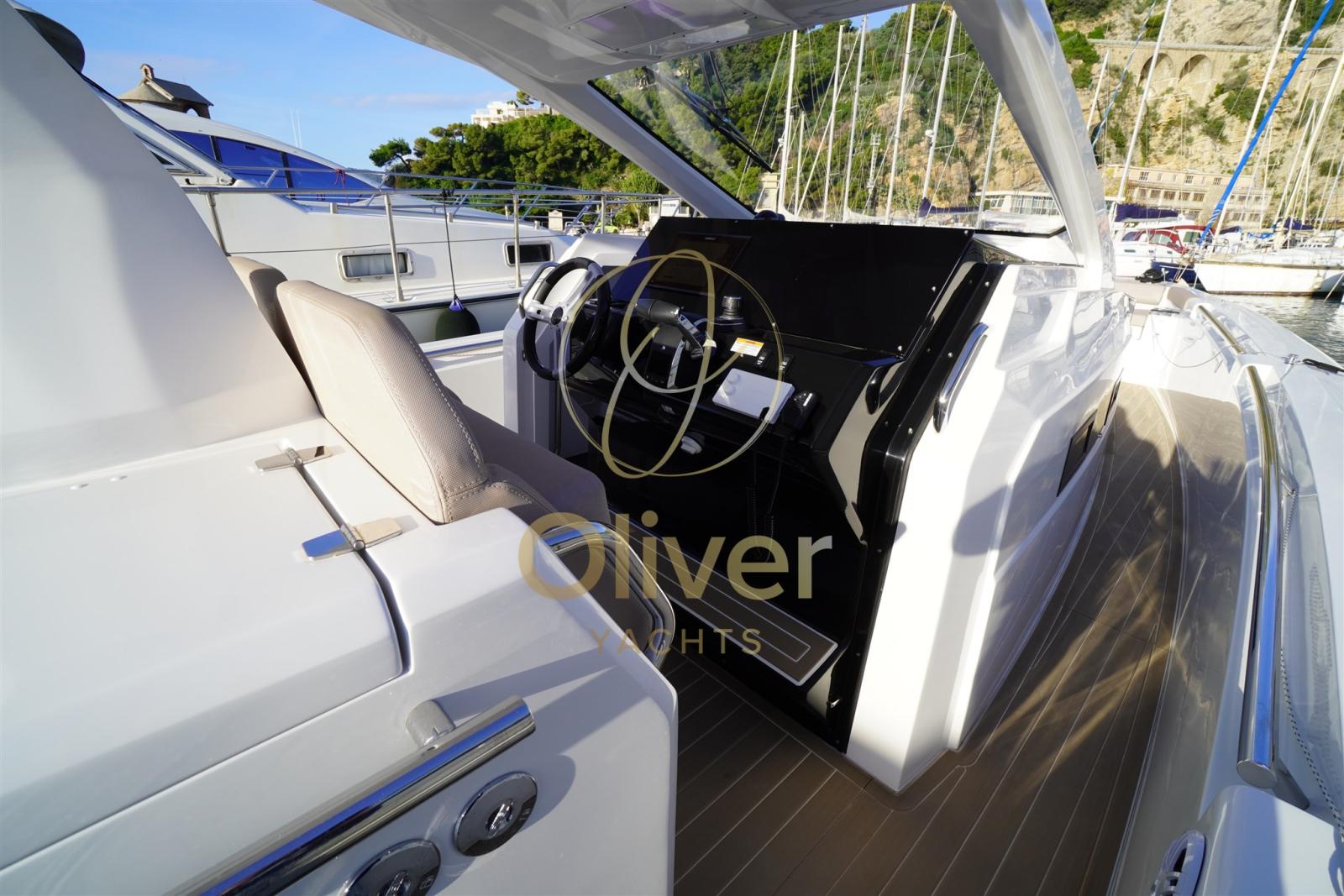 Alarme gaz, Alarme moteur, Alarme de pompe de cale, Auto Dynamic Trim Interceptor, Eau sous pression, Taquets pliants, Passavant en teck, Douche de cockpit, Extincteur(s) fixe(s), Plateforme arrière, Pompe de cale automatique, Pompe de cale manuelle, Cockpit en teck, Prise de quai, Connexion eau sous pression à quai, Guindeau électrique, Echelle de bain, Table, table de cockpit, Corne, T-Top.