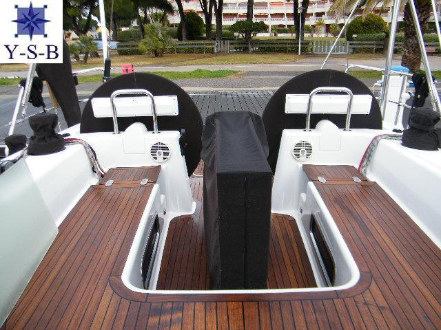 Table à carte sur tribord avec l'électronique intégrée ét dissimulée dans le mobilier du carré.