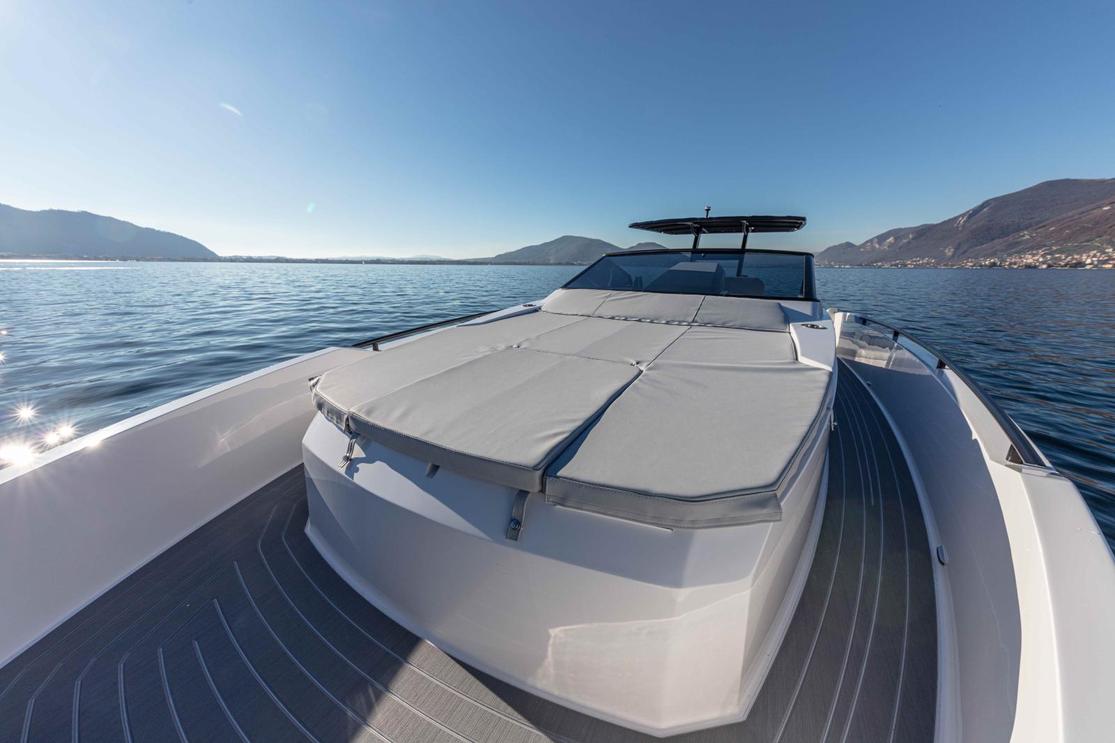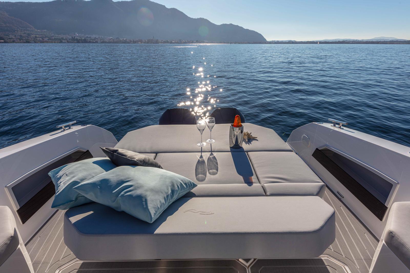 Bref, un dessin sculpté par le vent et vraiment très réussit. En s’approchant d’un peu plus près, le Rio apparaît sous sa véritable apparence, celle d’un day cruiser de type walk around. On circule ainsi facilement tout autour de la proue, un avantage lors des manoeuvres.