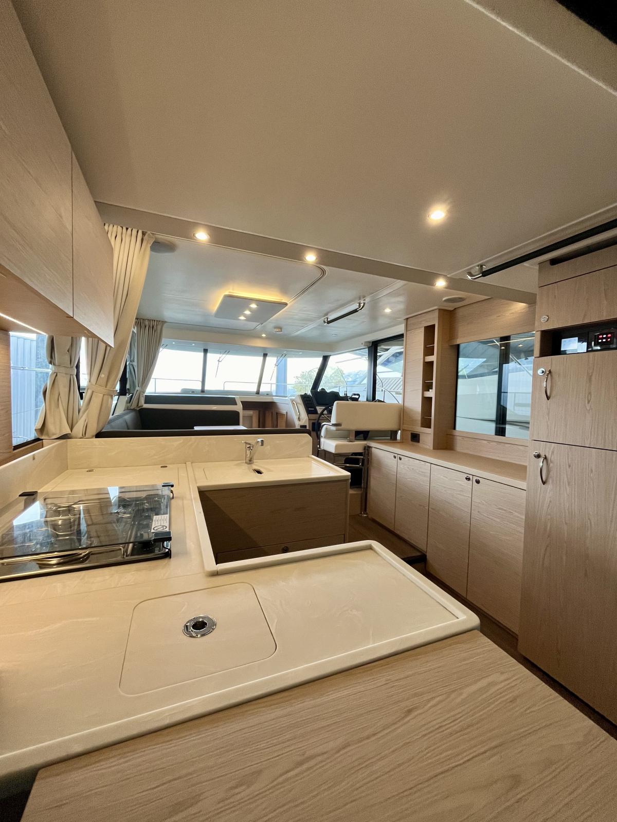 Le bateau est motorisé en Yanmar 8LV320 2X320, version 3 cabines et deux salles d'eau Alpi chêne dosse.