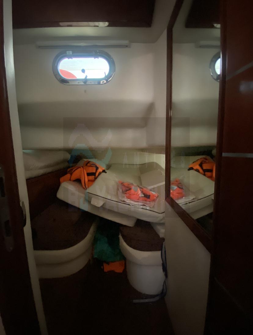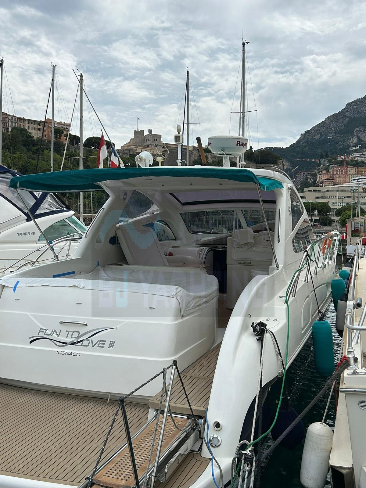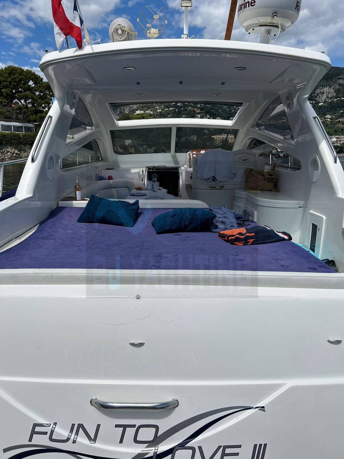 Ce modèle offre 2 cabines doubles, 2 salles de bain avec WC électriques, un salon lumineux en bois, une cuisine équipée et une grande plage arrière. Motorisé avec 2 VOLVO D6 435cv (IPS 600), avec seulement 413 heures.