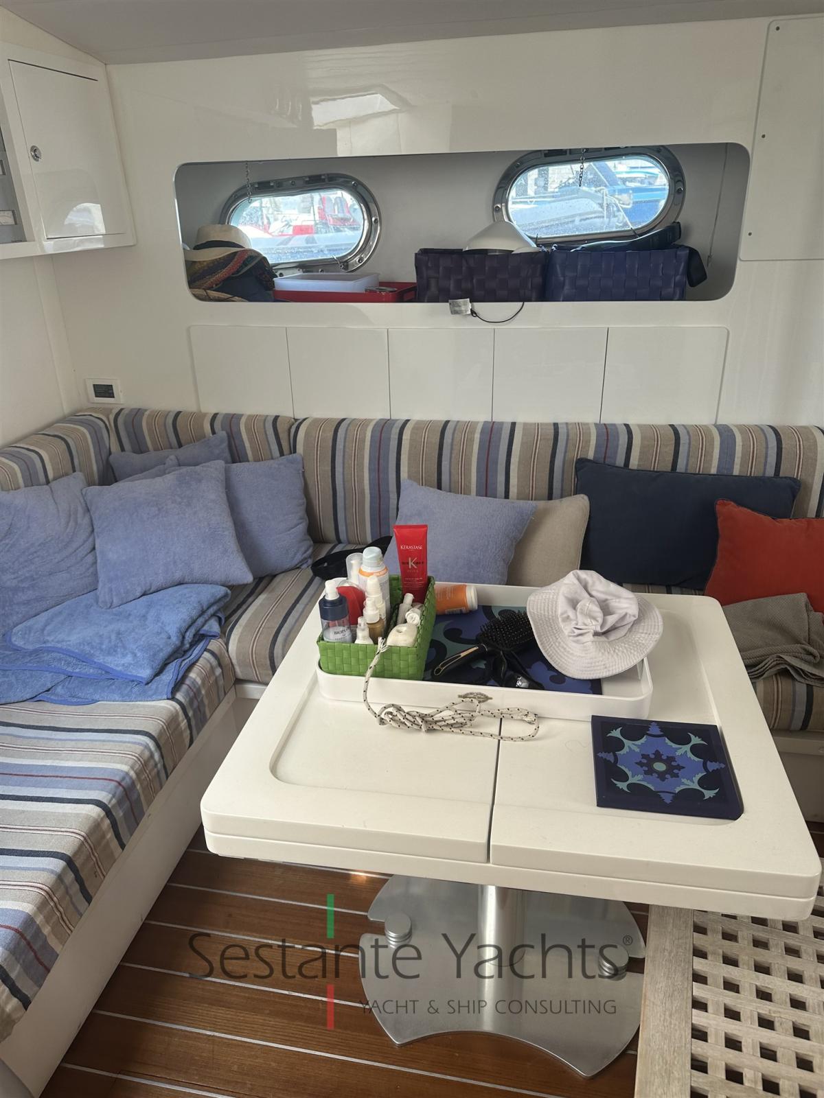 Alarme gaz, Alarme moteur, Ouverture du compartiment moteur électrique, Eau sous pression, Passavant en teck, Douche de cockpit, Flaps hydrauliques, Extincteur(s) fixe(s), Indicateurs de flaps, Lavabo dans le cockpit, Éclairage de courtoisie, Plateforme arrière, Pompe de cale automatique, Porte latérale, Cockpit en teck, Prise de quai, Rollbar, Guindeau électrique, Echelle de bain, Selles pour Annexe, table de cockpit, Table pliante de salon, Corne.
