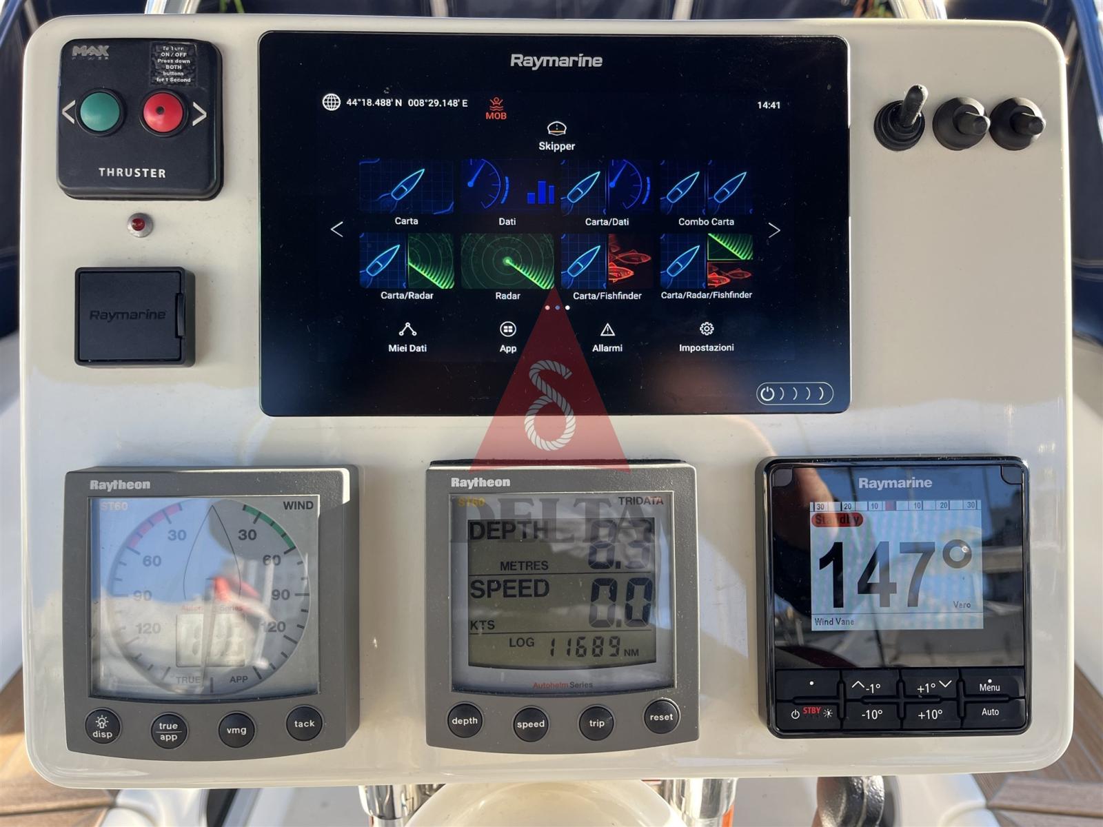 AIS, Indicateur d'angle de barre, Antenne radar, Ordinateur fixe de bord, DSC VHF (AICOM ICM330), Pilote automatique (RAYMARINE con Telecomando), Plotter GPS (RAYMARINE AXIOM 9), Radar (RAYMARINE QUANTUM), Sondeur.