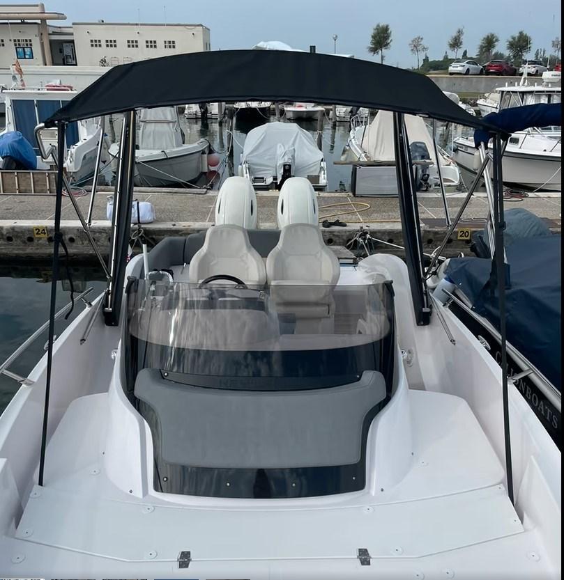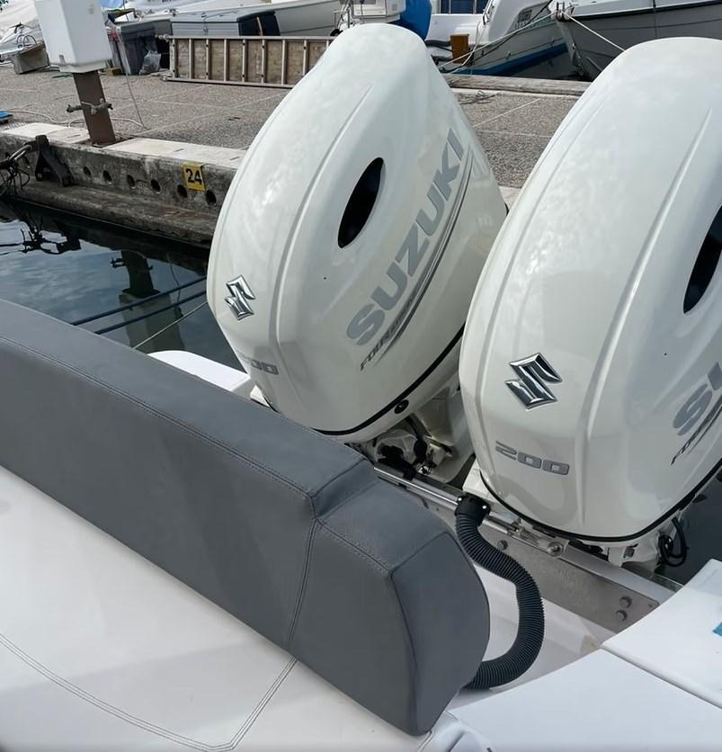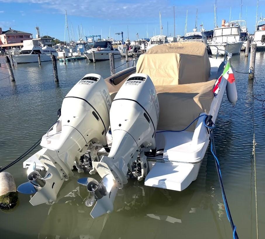 Alarme moteur, 3 Batteries (nuove 2021), Chargeur de batterie (nuovo 2021 Bluetooth), Couleur spéciale (scafo nero), Flaps électriques, Indicateurs de flaps, Lavabo dans le cockpit, Éclairage de courtoisie, Pompe de cale automatique, Porte latérale, Cockpit en teck (similar teak), Prise de quai, Guindeau électrique, Echelle de bain, table de cockpit, Table pliante de salon, Corne.
