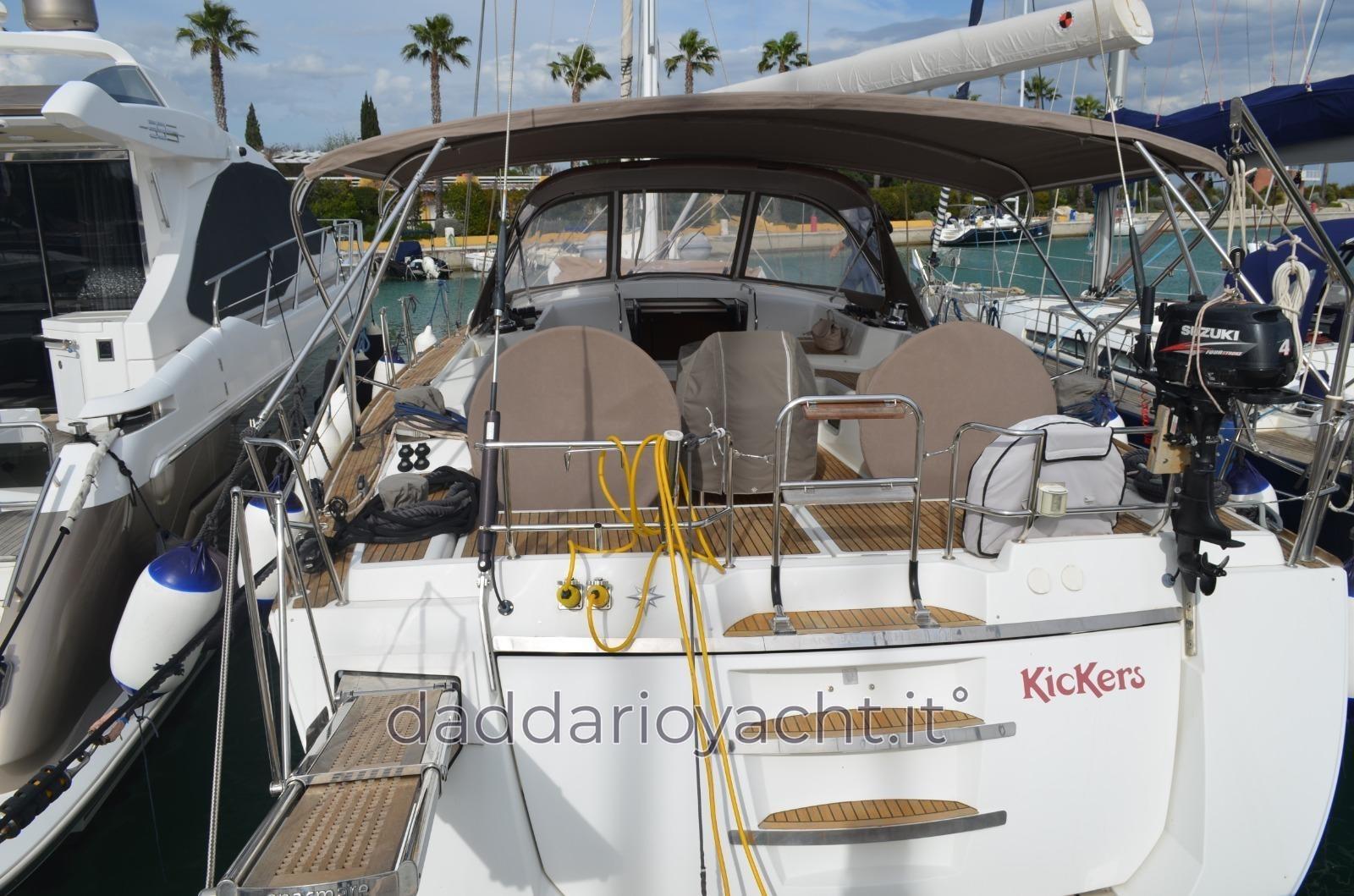 Eau sous pression, 3 Batteries, Passavant en teck, Douche de cockpit, Double barre à roue, Garage à annexe, Éclairage de courtoisie, Panneau solaire, Passerelle (idraulica), Pompe de cale automatique, Pompe de cale manuelle, Porte latérale, Cockpit en teck, Prise de quai, Guindeau électrique, Echelle de coupée, Echelle de bain, Chaise support HB, table de cockpit, Annexe (310 HYP + Fuoribordo Honda 4CV), Corne, 4 Winch électrique.